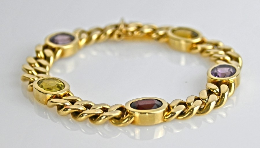 ARMBAND schwere Panzerkette mit 5verschiedenen facettierten gefassten Edelsteinen in ovalen Fassungen: 2 Amethyste, 2 Peridot 1 Granatstein , Kastenverschluss mit Sicherheitsachten, Gelbgold 14ct, 55,27g, L 19cm