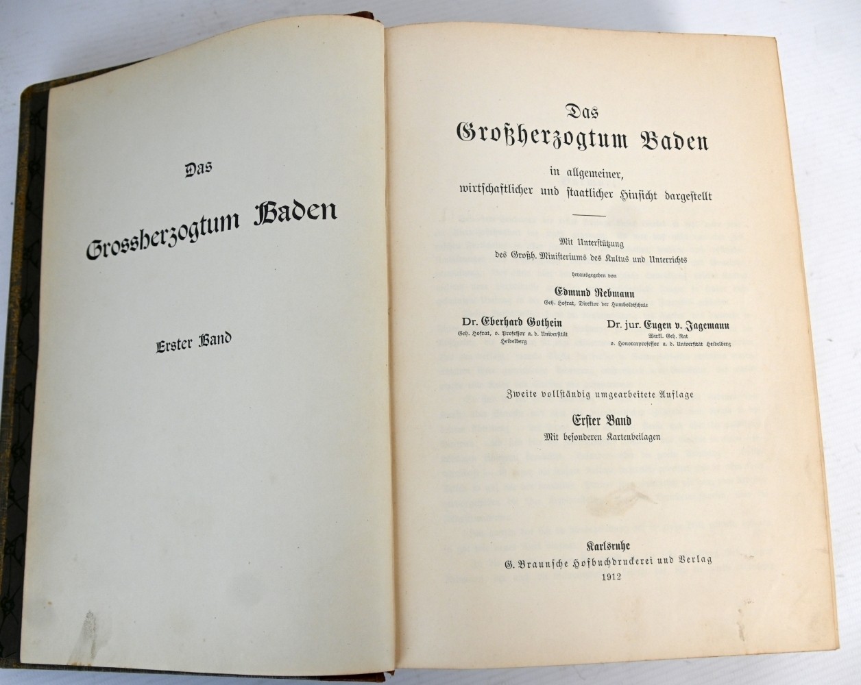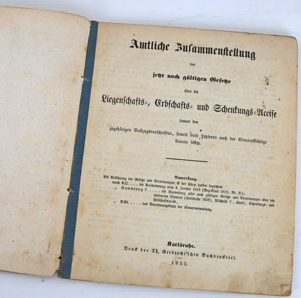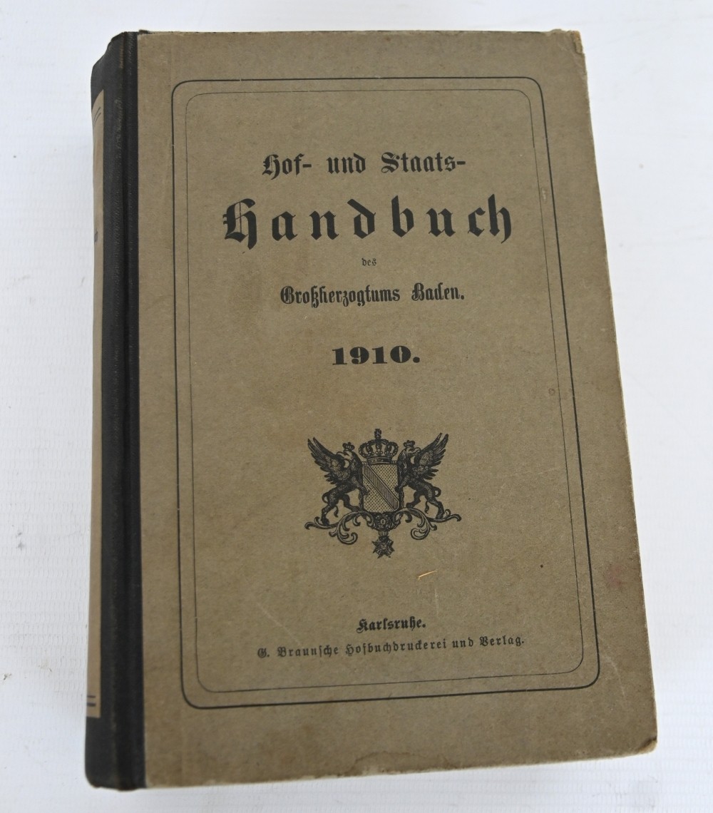 BADEN sechs Werke: ''Hof- und Staats-Handbuch des Großherzogtums Baden'', G. Braunsche Hofbuchdruckerei und Verlag, Karlsruhe, 1910; ''Das Großherzogtum Baden'', Erster Band, G. Braunsche Hofbuchdruckerei und Verlag, Karlsruhe, 1912; ''Badisches Landrecht'', Dr. Hachenburg; ''Amtliche Zusammenstellung der Gesetze über die Liegenschafts-, Erbschafts- und Schenkungsaccise'', Th. Gerbrachtsche Buchdruckerei, Karlsruhe, 1855; zwei Exemplare: ''Vereins-Blatt der Amtsrevisoren im Großherzogthum Baden für Staatsschreiberei und Rechtspolizei'', Wilhelm Hasper Hofbuchdruckerei, Karlsruhe, 1838 und 1839