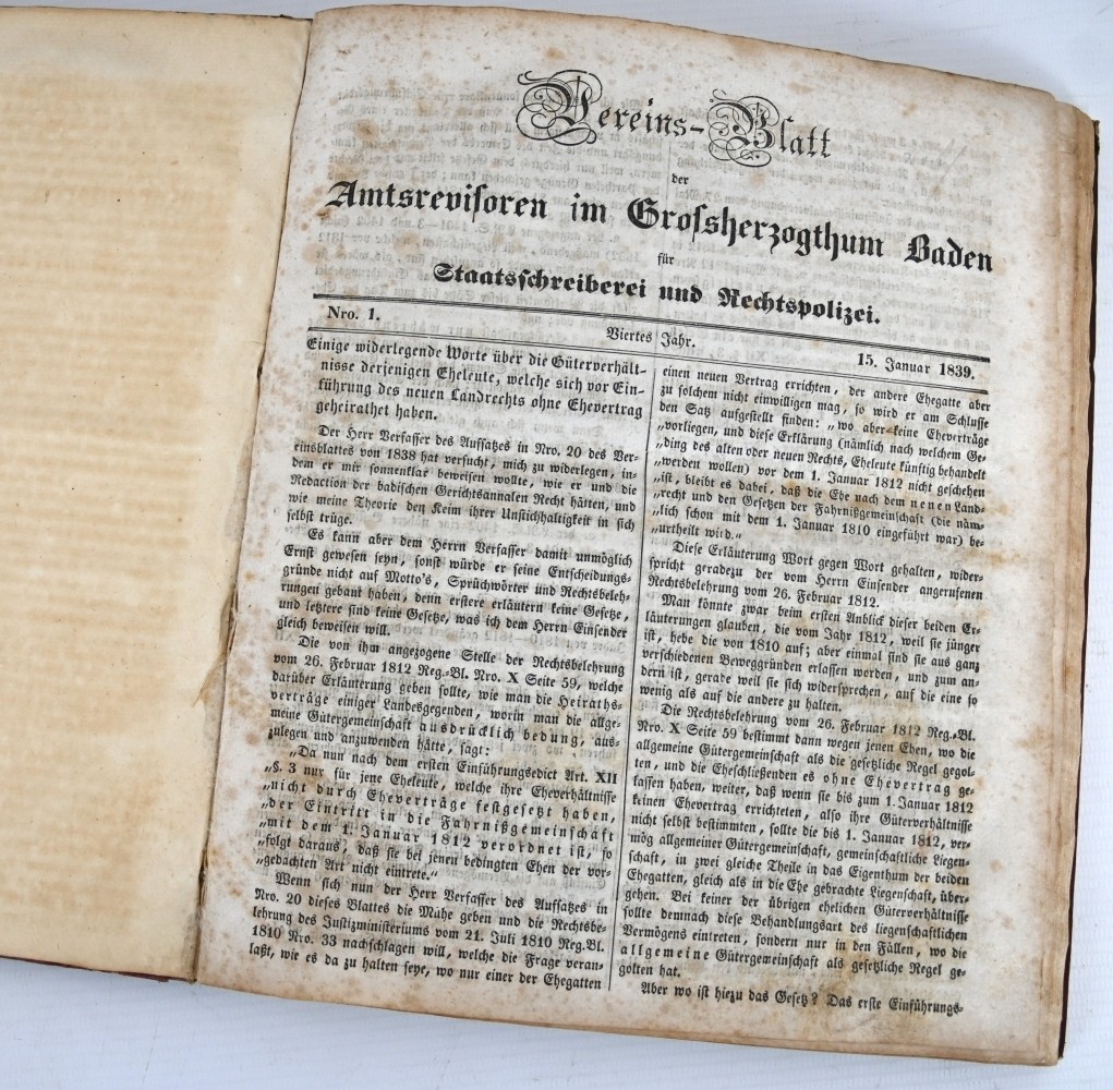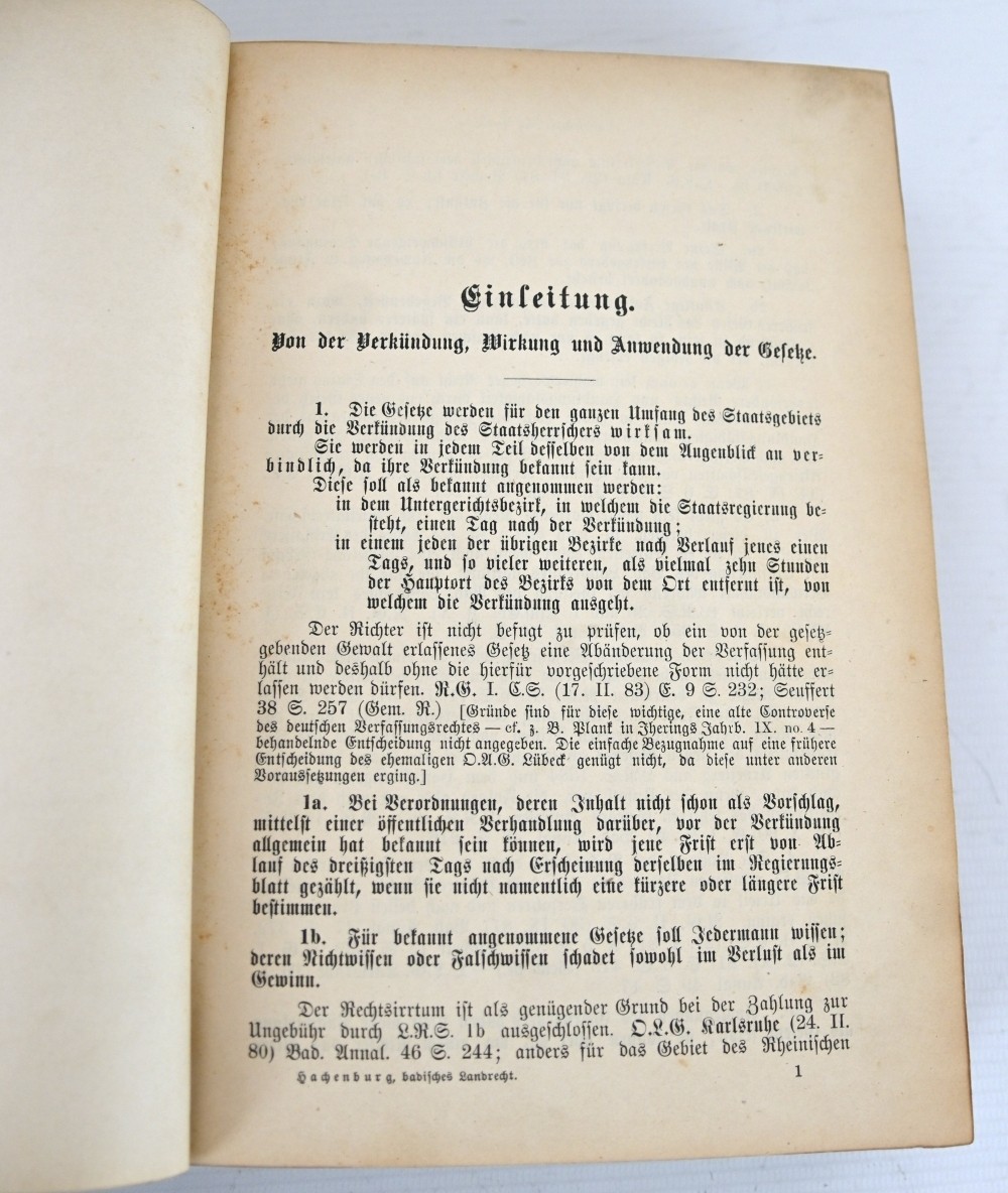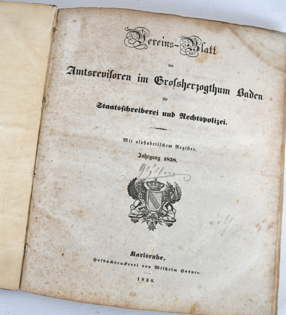 BADEN sechs Werke: ''Hof- und Staats-Handbuch des Großherzogtums Baden'', G. Braunsche Hofbuchdruckerei und Verlag, Karlsruhe, 1910; ''Das Großherzogtum Baden'', Erster Band, G. Braunsche Hofbuchdruckerei und Verlag, Karlsruhe, 1912; ''Badisches Landrecht'', Dr. Hachenburg; ''Amtliche Zusammenstellung der Gesetze über die Liegenschafts-, Erbschafts- und Schenkungsaccise'', Th. Gerbrachtsche Buchdruckerei, Karlsruhe, 1855; zwei Exemplare: ''Vereins-Blatt der Amtsrevisoren im Großherzogthum Baden für Staatsschreiberei und Rechtspolizei'', Wilhelm Hasper Hofbuchdruckerei, Karlsruhe, 1838 und 1839
