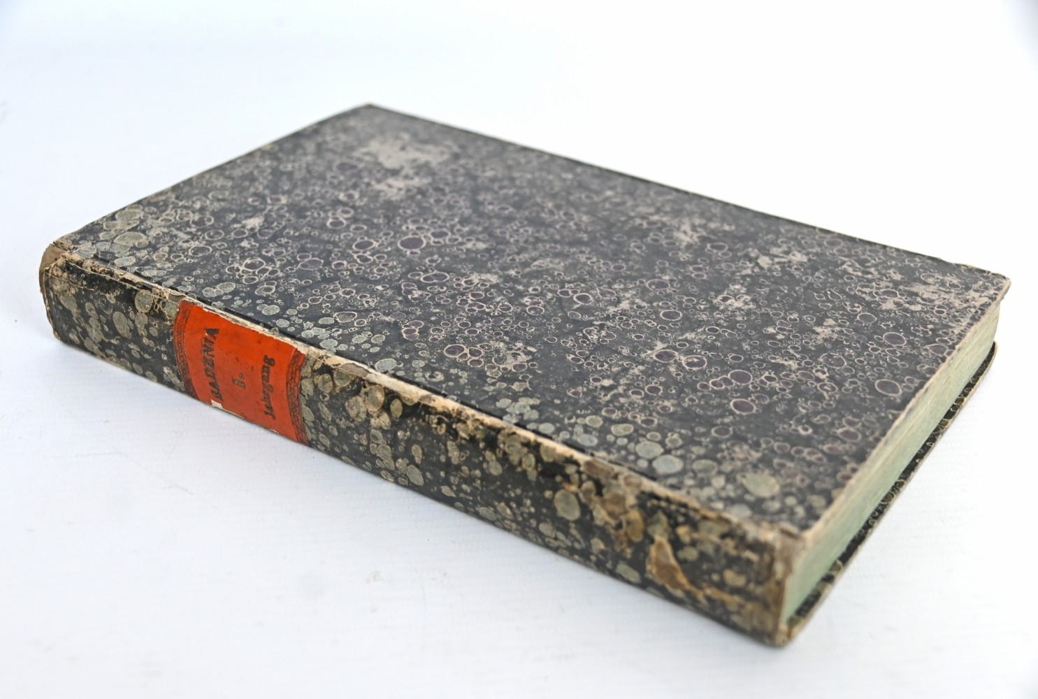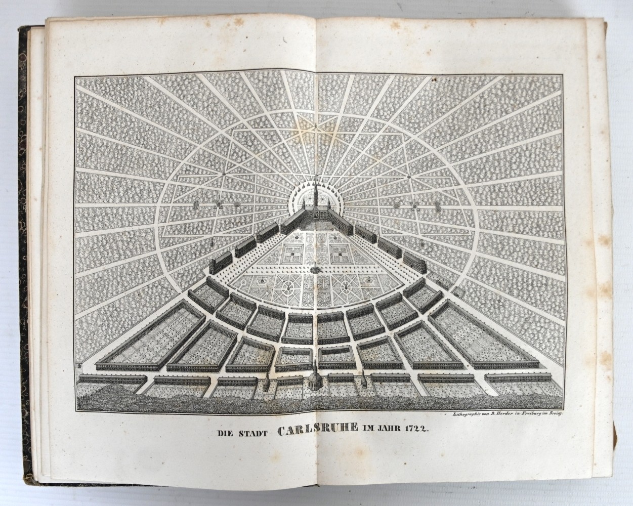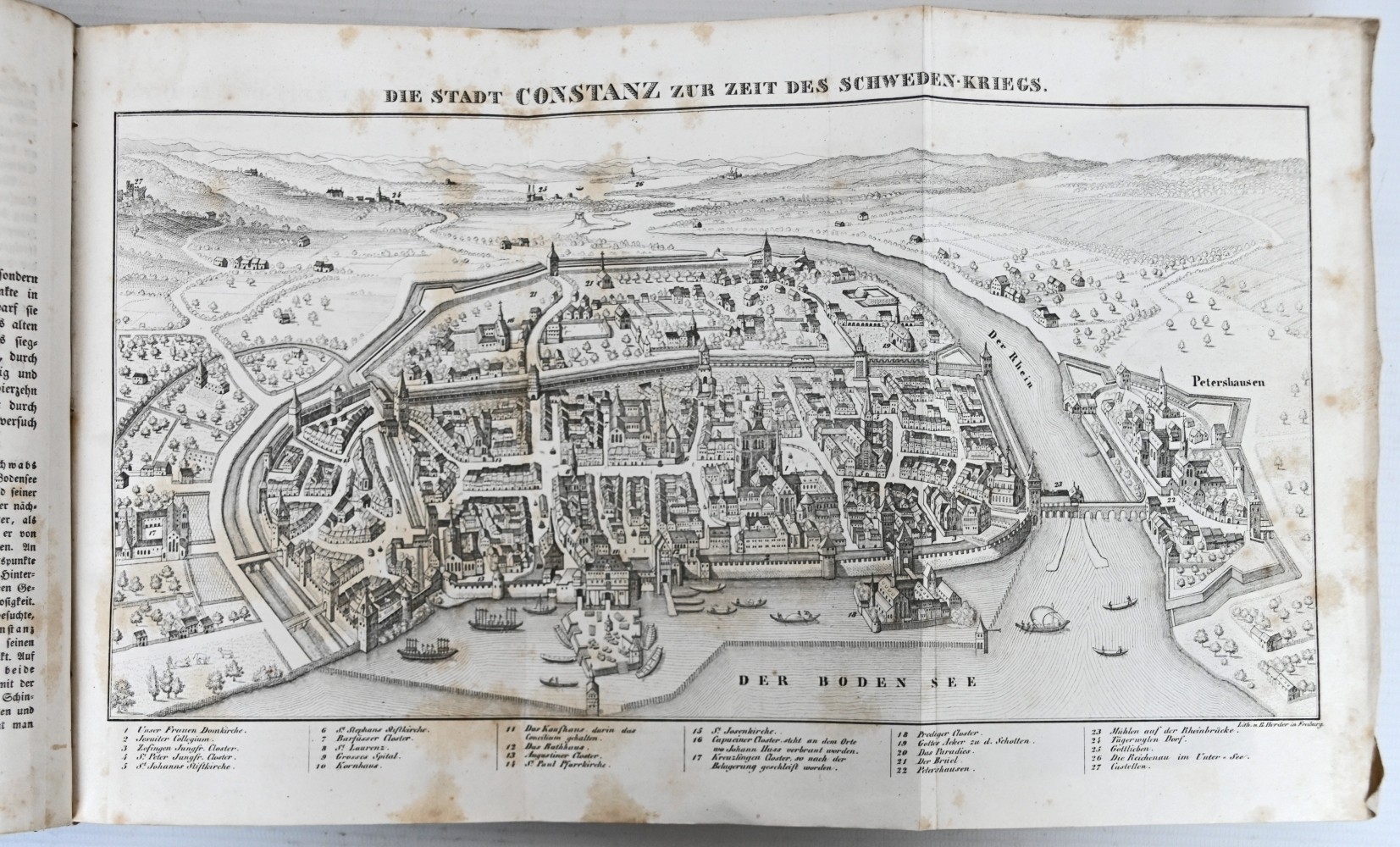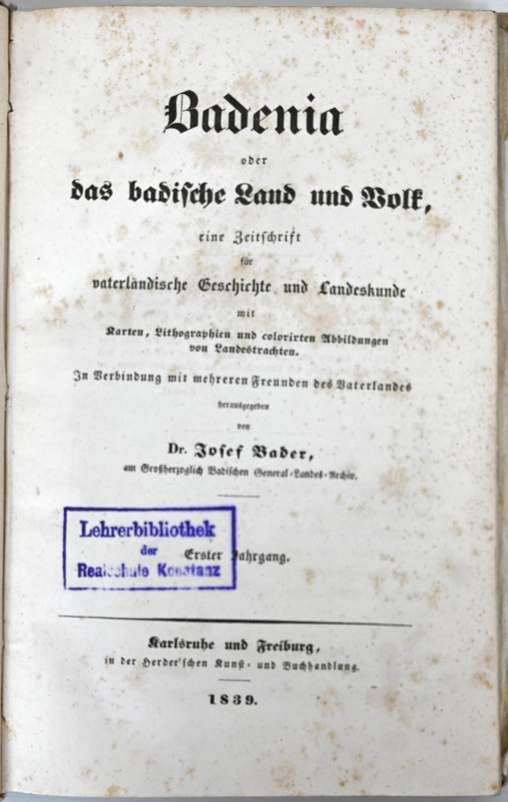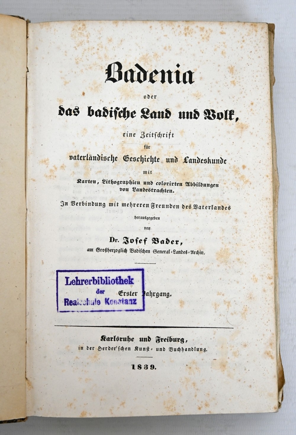 BADER Josef ''Badenia oder das badische Land und Volk. Eine Zeitschrift für vaterländische Geschichte und Landeskunde'', mit teilweise farbigen Lithographien und ausklappbaren Stahlstichen oder Karten (u. a. Ansicht von Konstanz zur Zeit des Schwedenkriegs), rund 300 Seiten, Verlag: Herder'sche Kunst- und Buchhandlung, 1. Jahrgang, Karlsruhe und Freiburg, 1839, Pappband mit Buntpapierbezug, stockfleckig, Gebrauchsspuren