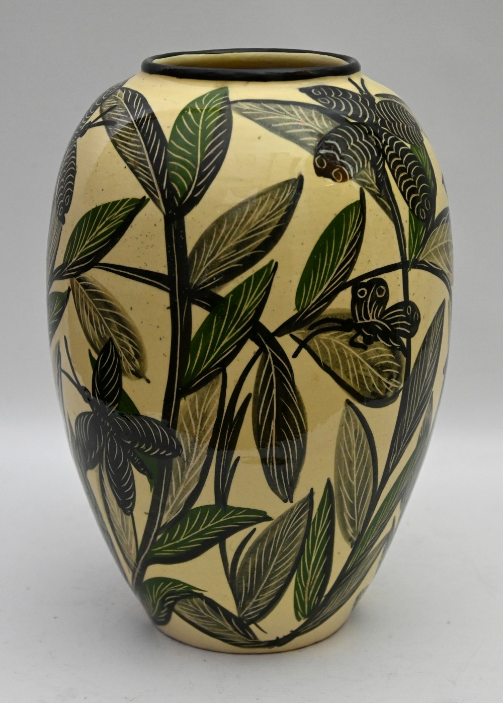 BODENVASE Karl Hug, bauchig, hellgelber Grund mit aufgemaltem grünem blätterartigen Dekor und Schmetterlingen, Bodenunterseite gemarkt Karl Hug Konstanz, H 34cm