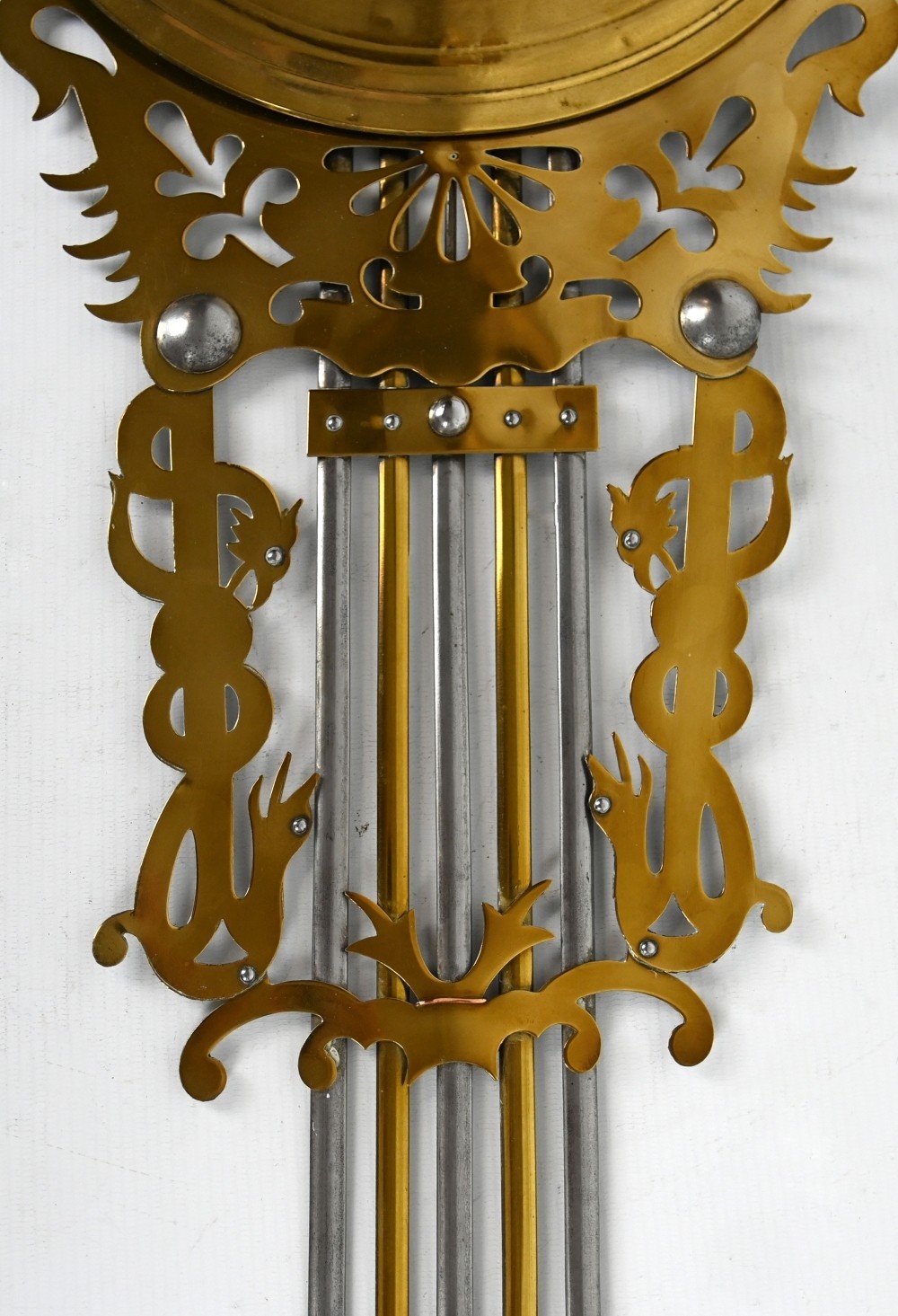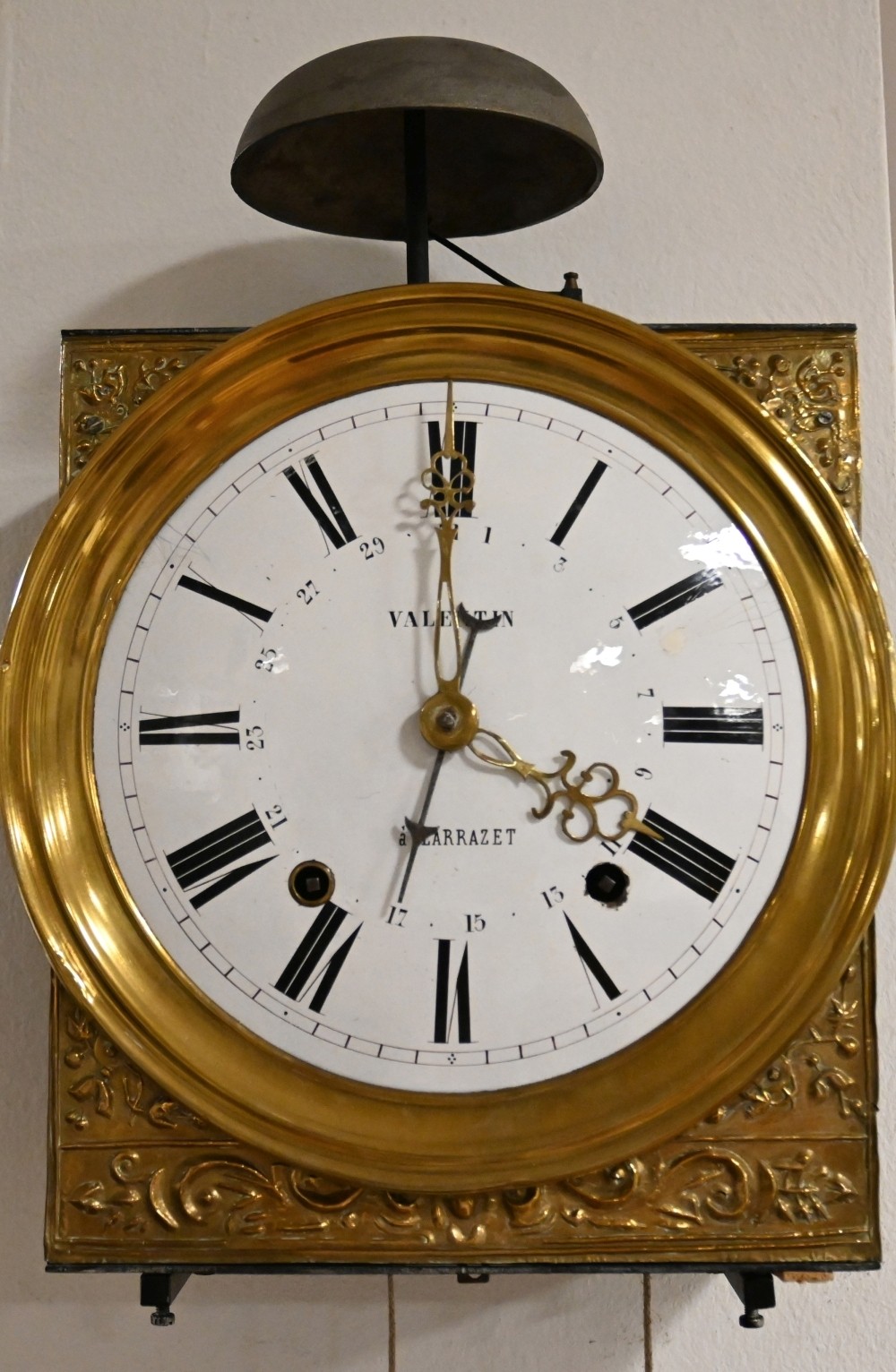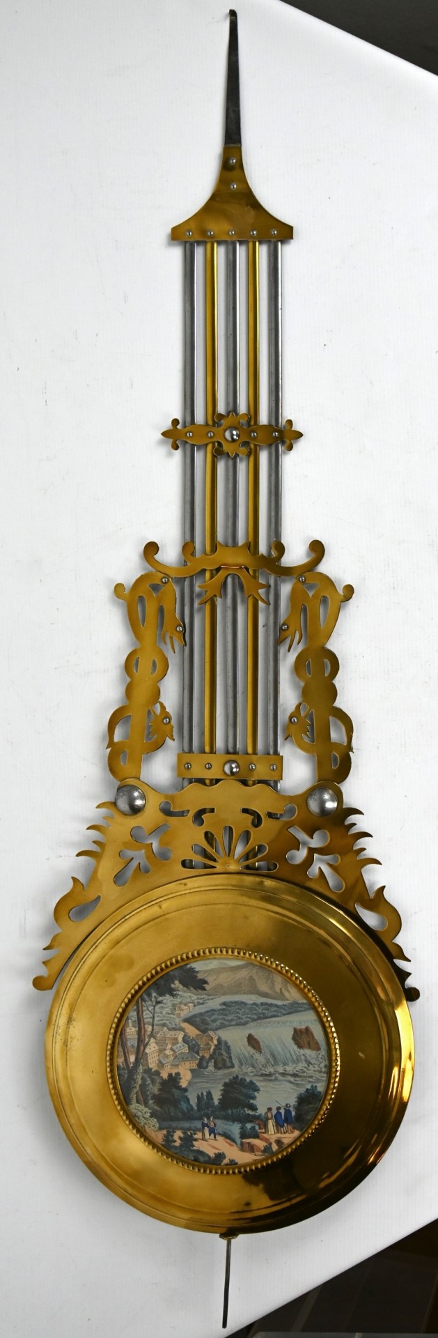 COMTOISEUHR Metallkorpus, mit aufgesetzter Glocke, Emailzifferblatt mit römischen und arabischen Ziffern bez. ''Valentin à Larrazet'', in vergoldetem Metallrahmen, mit dekorierter Basis, feines vergoldetes Kompensations-Prunkpendel, die Linse mit einem Landschaftsbild: Stadt an großem Wasserfall (wohl später eingesetzt), 138x29x15cm, Pendel 94 cm, Frankreich 19. Jh. *Typus der Comtoise Uhr aus dem Departement Franche Comté, sie wird in Deutschland meist Burgunderuhr genannt, diese hier kommt jedoch aus Larrazet in der Nähe von Montauban, Departement 82, Tarn-et-Garonne, sehr viel weiter südwestlich*