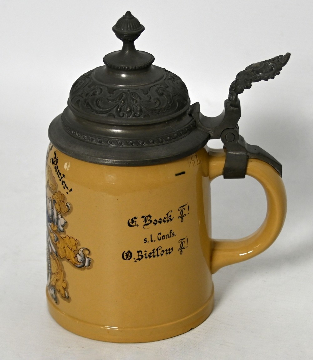 STUDENTICA Verbindungskrug der Burschenschaft Teutonia Jena e. V., mit polychrom gestaltetem Burschenschaftswappen, Datierung ''Weihn. 1894'' und Widmung ''z. fr. Erg.'', mit Zinndeckel, mit eingeritzten Kerben und Kreuzen *Die Burschenschaft wurde 1815 gegründet und konstituierte sich 1845. Seit 1861 gehört sie dem sog. ''Süddeutschen Kartell'' an. Nach dem Verbot durch die NS-Diktatur konnte sie erst nach 1989 aus West-Deutschland wieder nach Jena zurückkehren. Der seit jeher demokratisch ausgerichteten Vereinigung gehören heute Frauen und Männer an.*