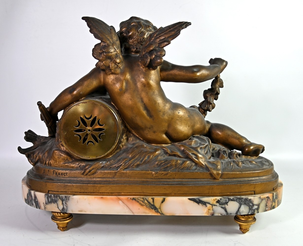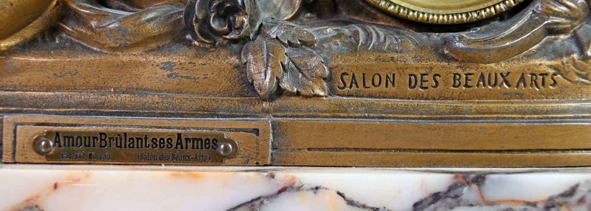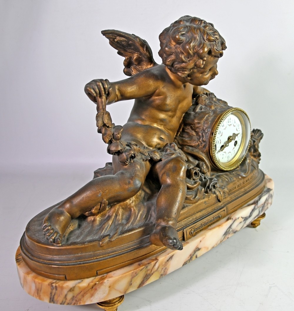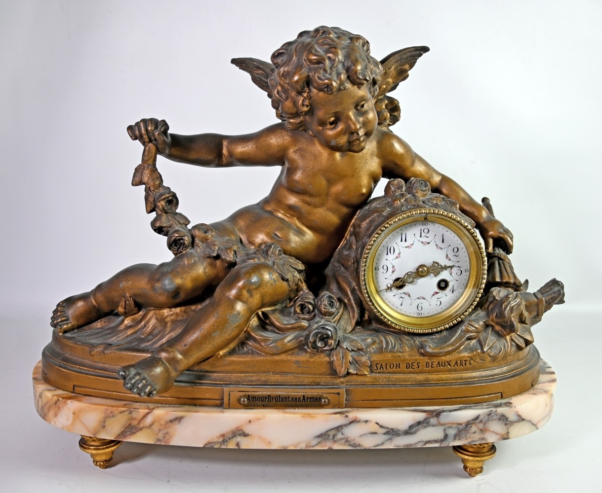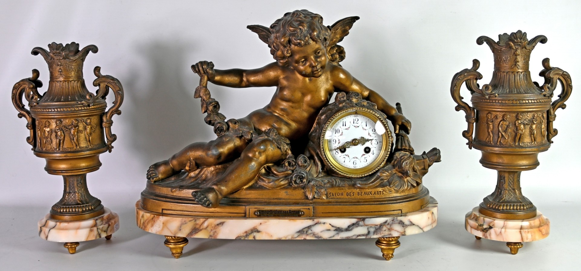 GROßE KAMINUHR seitlich zwei Vasen, Amor im Blumenfeld stützt sich auf eine blütenbekränzte Uhr, in der linken Hand hält er eine Fackel, in der Rechten ein Blütenband, der Köcher mit den Pfeilen liegt neben ihm auf dem Boden, Metallguss bronziert (Gebrauchsspuren) auf ovaler rötlicher Marmorplatte, Sockel mit Inschrift: ''amour brûlant ses armes'', darunter ''par Fr. Moreau- Salon des Beaux Arts'', rückseitig: A.J. France, Uhr mit Emailziffernblatt, arabischen Ziffern umgeben von farbigen Blütengirlanden, Schlag auf Glocke, signiert ''Vincenti Medaille d`Argent 1855'', Frankreich 19. Jh., H 48cm, B 36cm, T 18cm, dazu passend zwei Urnenvasen in bronziertem Metall mit tanzenden Putten als Wandungsdekoration, auf Marmorplatte mit Füßen, H 32cm, D 18cm