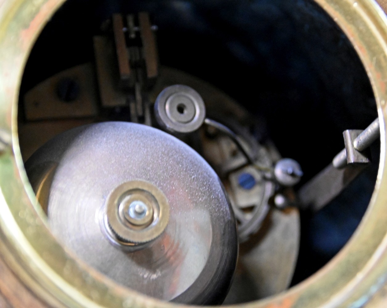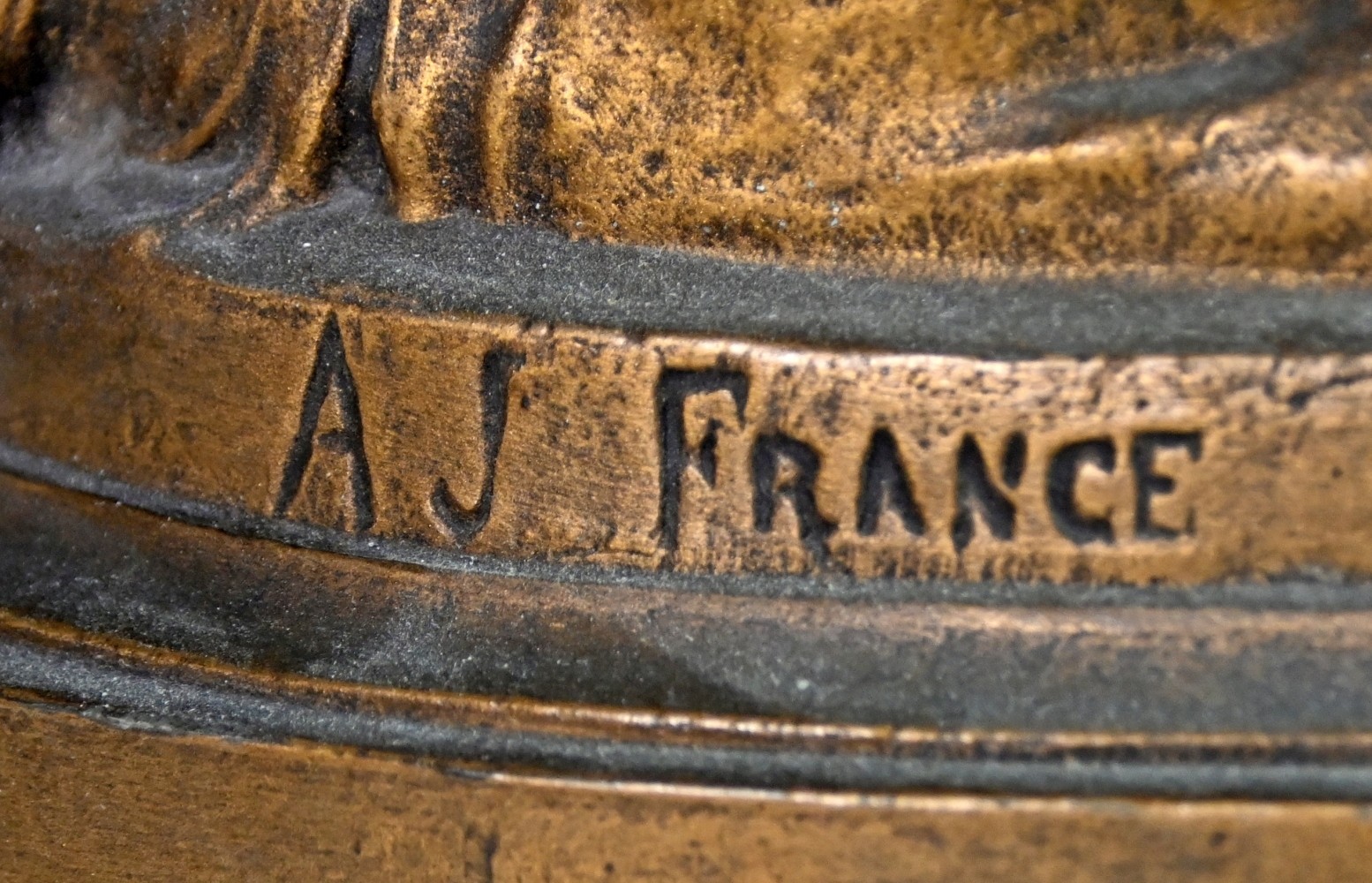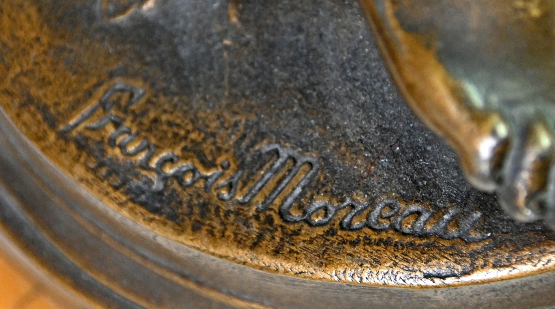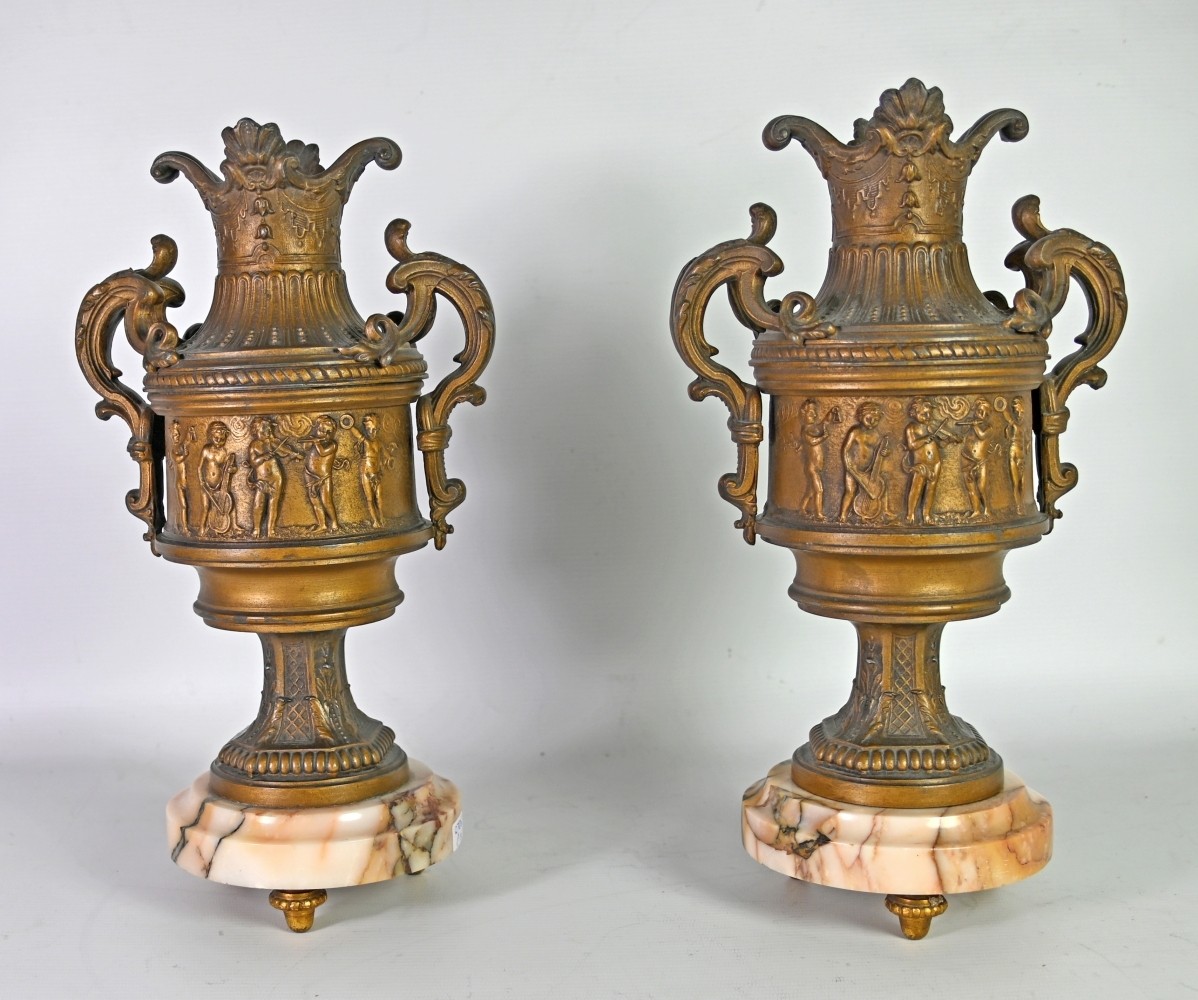GROßE KAMINUHR seitlich zwei Vasen, Amor im Blumenfeld stützt sich auf eine blütenbekränzte Uhr, in der linken Hand hält er eine Fackel, in der Rechten ein Blütenband, der Köcher mit den Pfeilen liegt neben ihm auf dem Boden, Metallguss bronziert (Gebrauchsspuren) auf ovaler rötlicher Marmorplatte, Sockel mit Inschrift: ''amour brûlant ses armes'', darunter ''par Fr. Moreau- Salon des Beaux Arts'', rückseitig: A.J. France, Uhr mit Emailziffernblatt, arabischen Ziffern umgeben von farbigen Blütengirlanden, Schlag auf Glocke, signiert ''Vincenti Medaille d`Argent 1855'', Frankreich 19. Jh., H 48cm, B 36cm, T 18cm, dazu passend zwei Urnenvasen in bronziertem Metall mit tanzenden Putten als Wandungsdekoration, auf Marmorplatte mit Füßen, H 32cm, D 18cm
