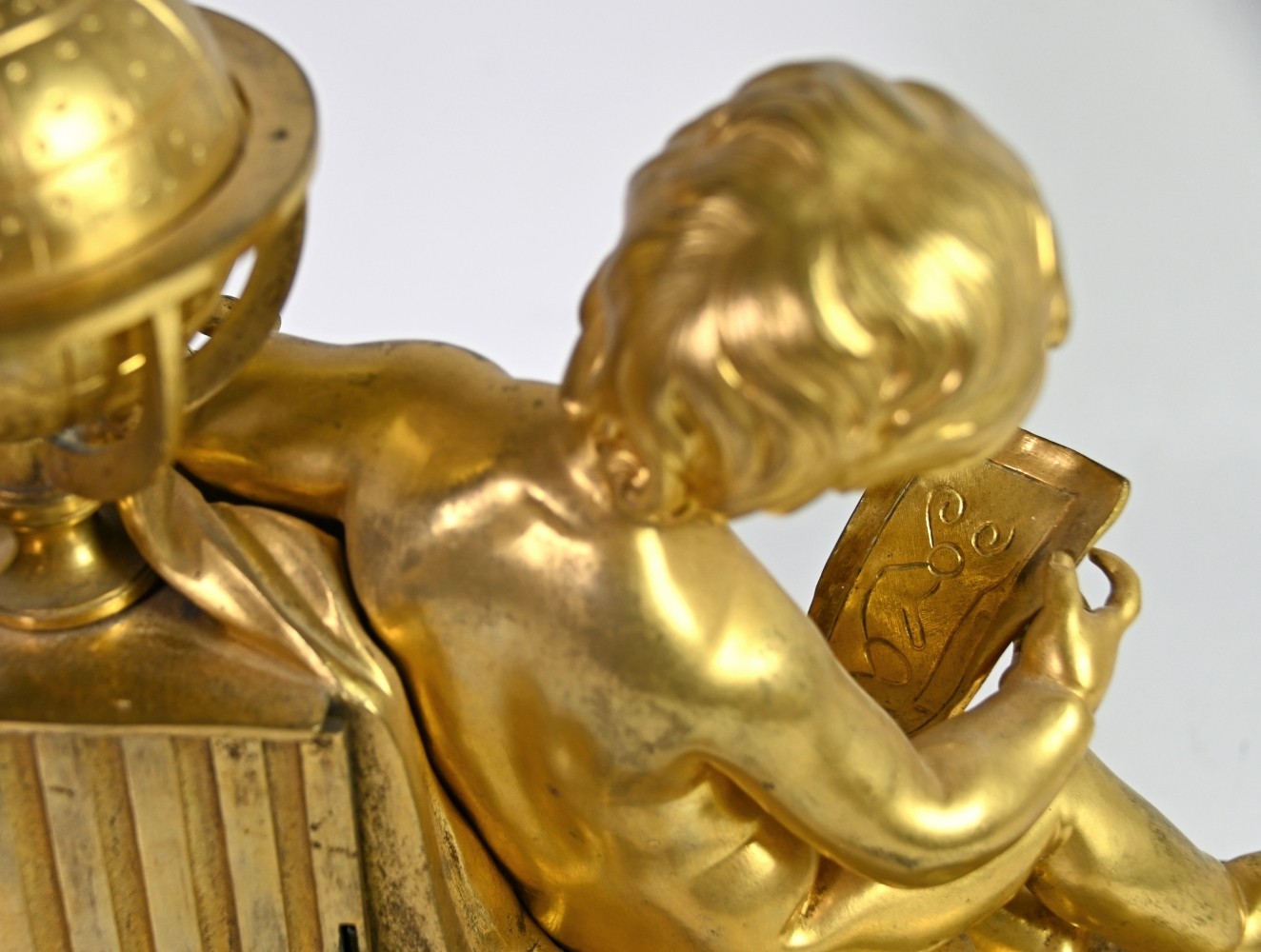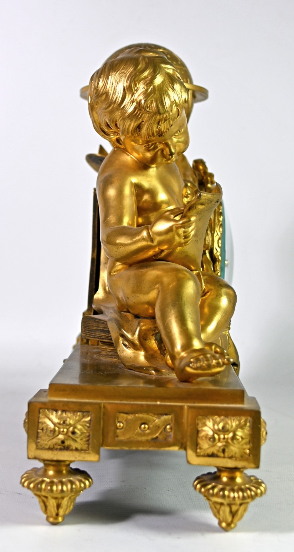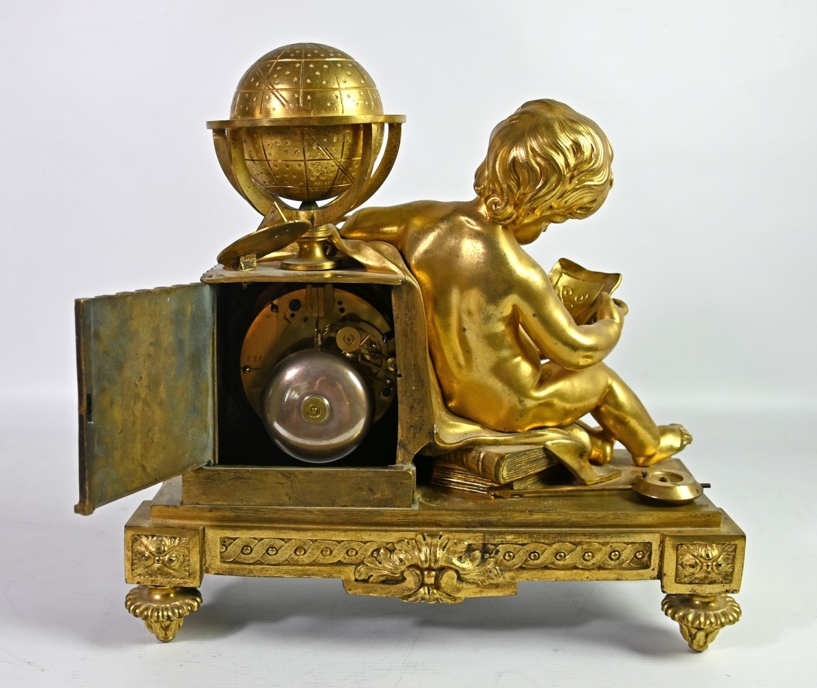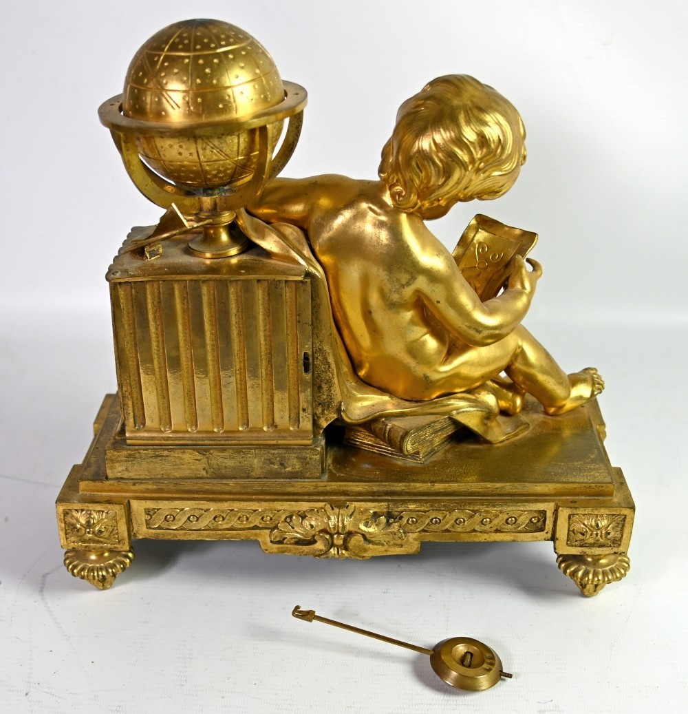 KAMINUHR aus vergoldeter Bronze mit plastischem, lesendem Jungen, der sich an das dekorierte Uhrengehäuse mit aufgesetztem Globus, Sonnenuhr, lehnt. Uhr mit Emailziffernblatt bezeichnet ''Lenoir'', römischen Ziffern, vergoldete Zeiger, Glasabdeckung. Auf rechteckiger Standplatte mit spitz zulaufenden Füßen, Frankreich 19. Jh., Werk bezeichnet: ''Lenoir à Paris'' Schlag auf Glocke, 7-Tagewerk, Pendule, Pendel. Vergoldung berieben, gut erhalten, 30x29x12cm