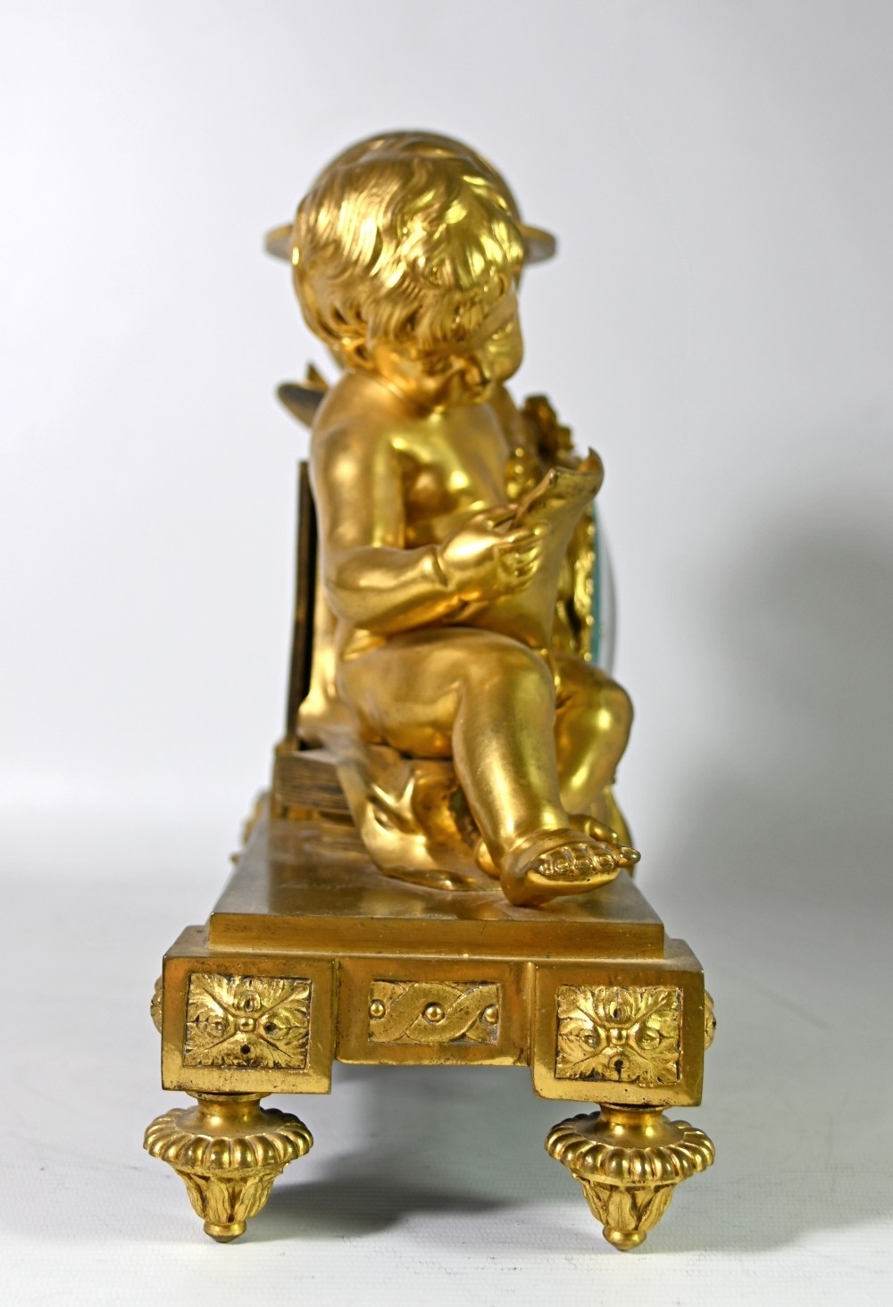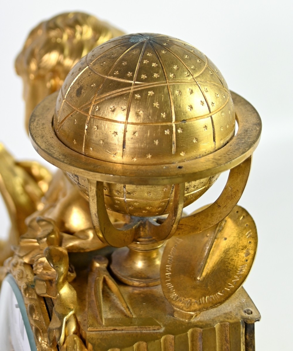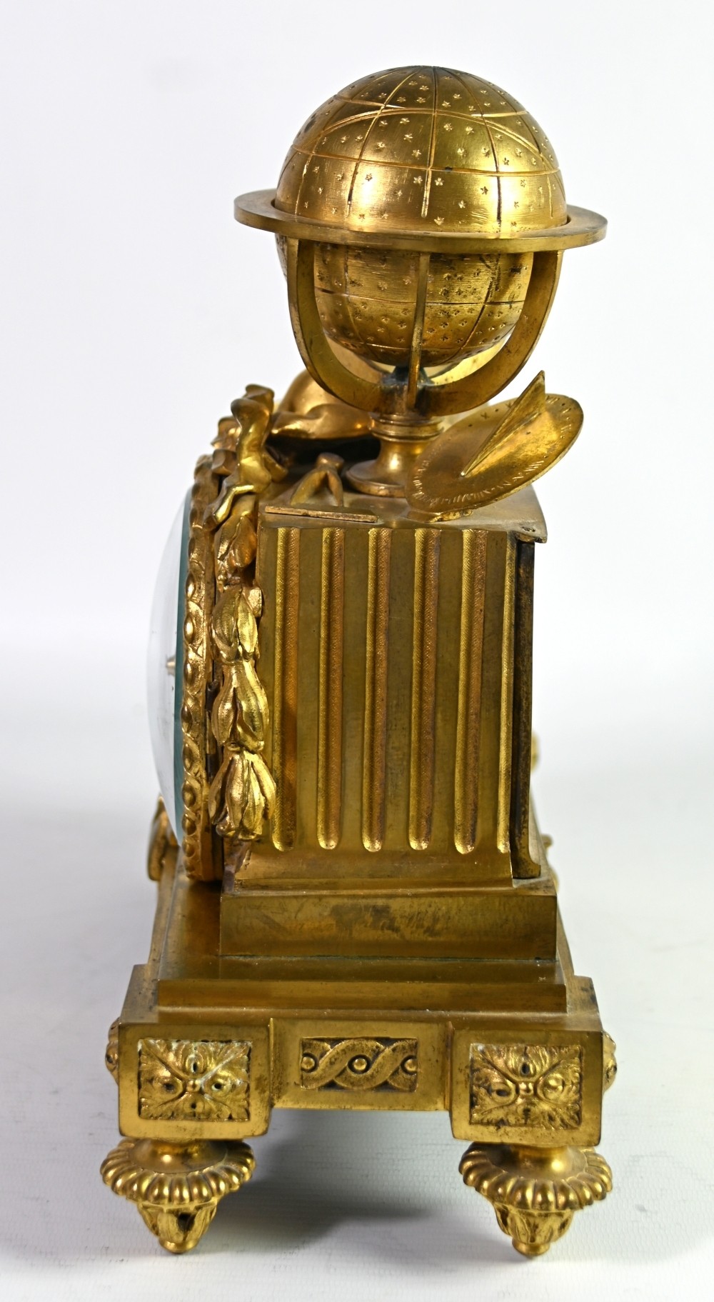 KAMINUHR aus vergoldeter Bronze mit plastischem, lesendem Jungen, der sich an das dekorierte Uhrengehäuse mit aufgesetztem Globus, Sonnenuhr, lehnt. Uhr mit Emailziffernblatt bezeichnet ''Lenoir'', römischen Ziffern, vergoldete Zeiger, Glasabdeckung. Auf rechteckiger Standplatte mit spitz zulaufenden Füßen, Frankreich 19. Jh., Werk bezeichnet: ''Lenoir à Paris'' Schlag auf Glocke, 7-Tagewerk, Pendule, Pendel. Vergoldung berieben, gut erhalten, 30x29x12cm