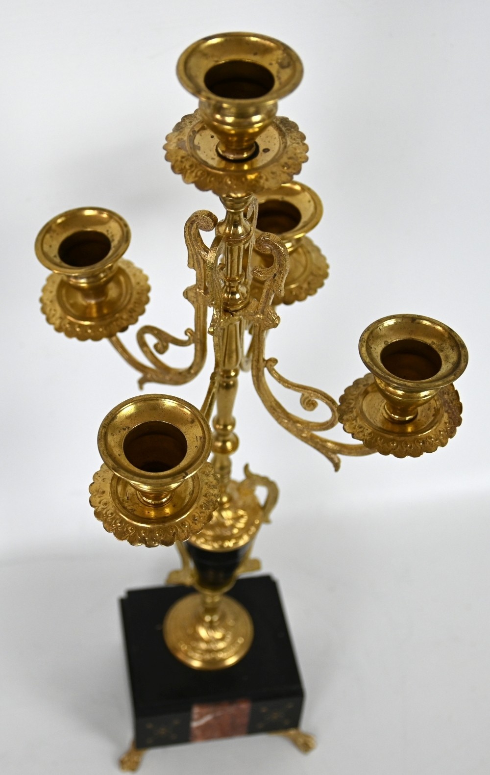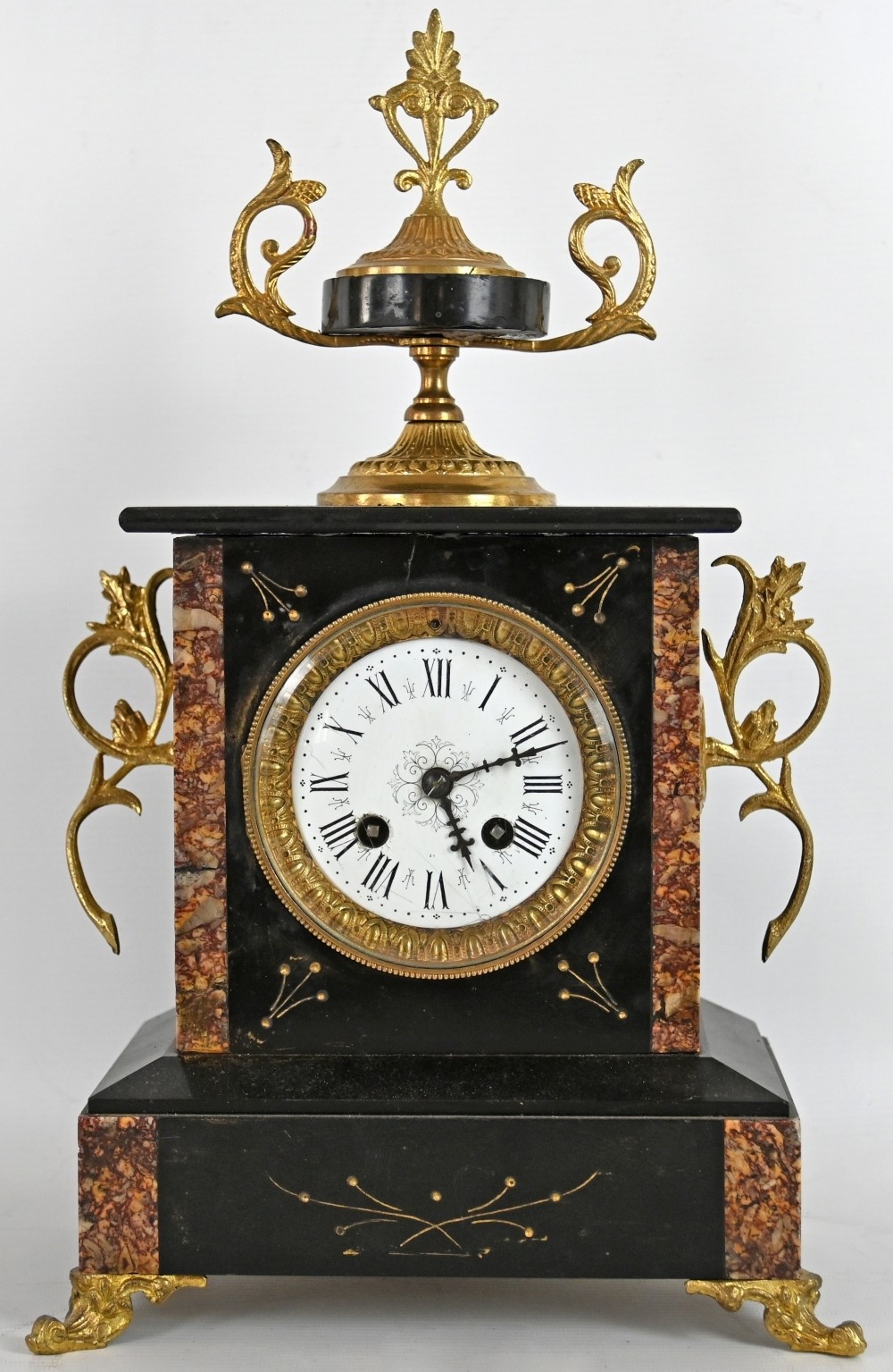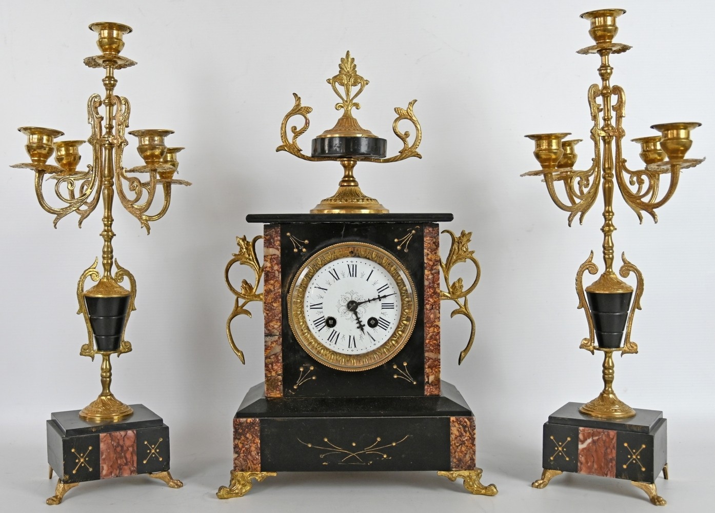 KAMINUHR mit seitlichen Leuchtern, dunkler Marmor mit vergoldeten Metallapplikationen, 19. Jh., rechteckiges Uhrengehäuse auf abgesetztem Stand mitf vergoldeten Füßen, stilisierte Dekorelemente und rote Marmorelemente als Verzierung auf der Vorderseite, seitlich vergoldete Metallhandhaben. Auf der Abschlussplatte aufgesetzte Vase, H 40cm. Seiltich der Uhr zwei passende fünfflammige Leuchter mit geschwungenen Armen, H 42,5cm