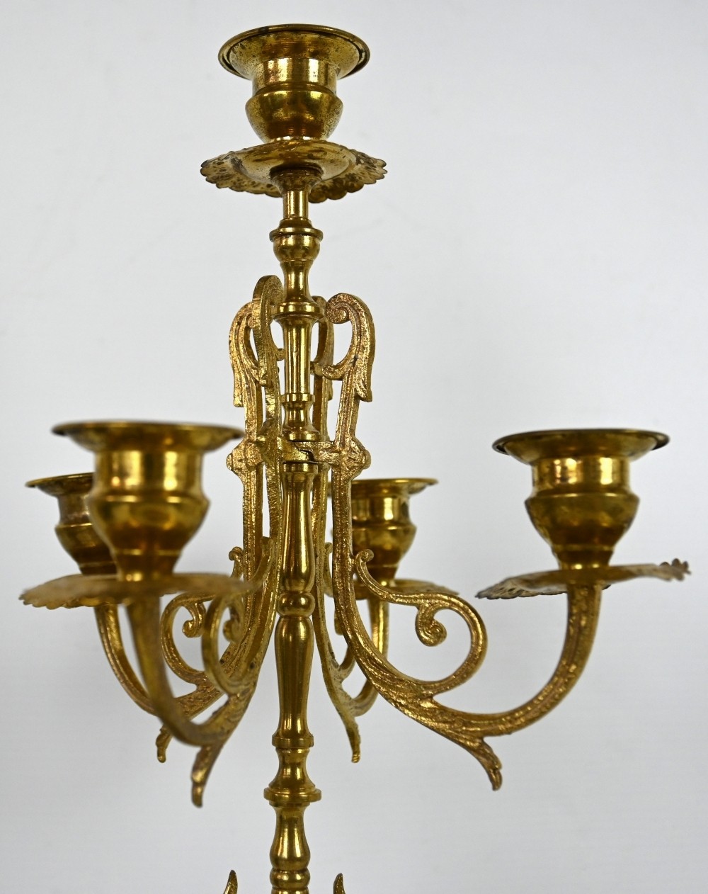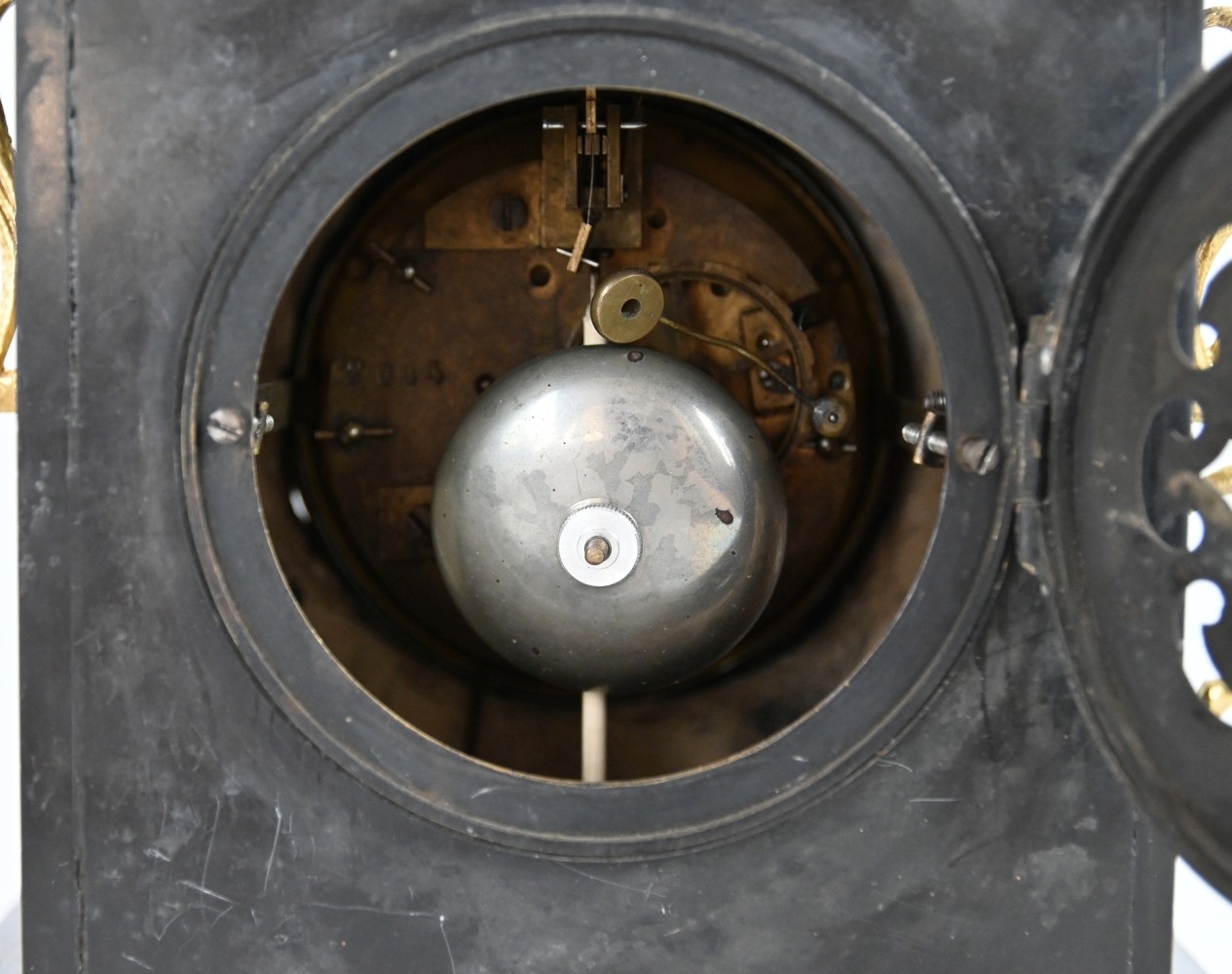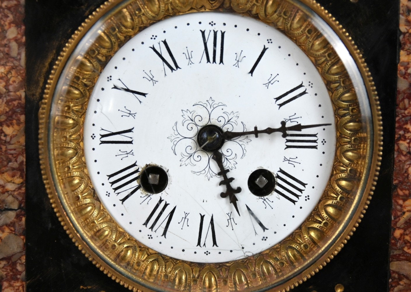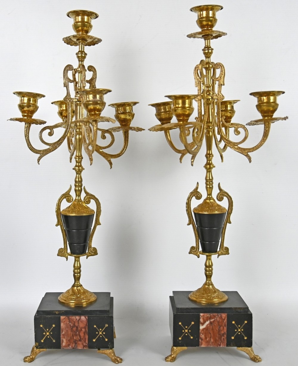 KAMINUHR mit seitlichen Leuchtern, dunkler Marmor mit vergoldeten Metallapplikationen, 19. Jh., rechteckiges Uhrengehäuse auf abgesetztem Stand mitf vergoldeten Füßen, stilisierte Dekorelemente und rote Marmorelemente als Verzierung auf der Vorderseite, seitlich vergoldete Metallhandhaben. Auf der Abschlussplatte aufgesetzte Vase, H 40cm. Seiltich der Uhr zwei passende fünfflammige Leuchter mit geschwungenen Armen, H 42,5cm