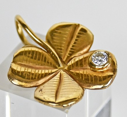 KLEEBLATT-ANHÄNGER plastisches Glückskleeblatt mit Brillant um 0,1ct besetzt, Gelbgold 14ct, 5,28g, L 30mm, B 20mm
