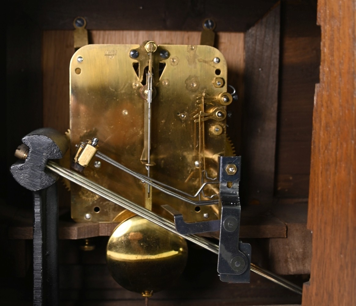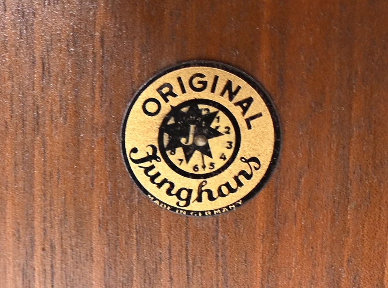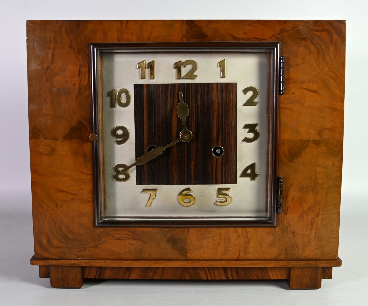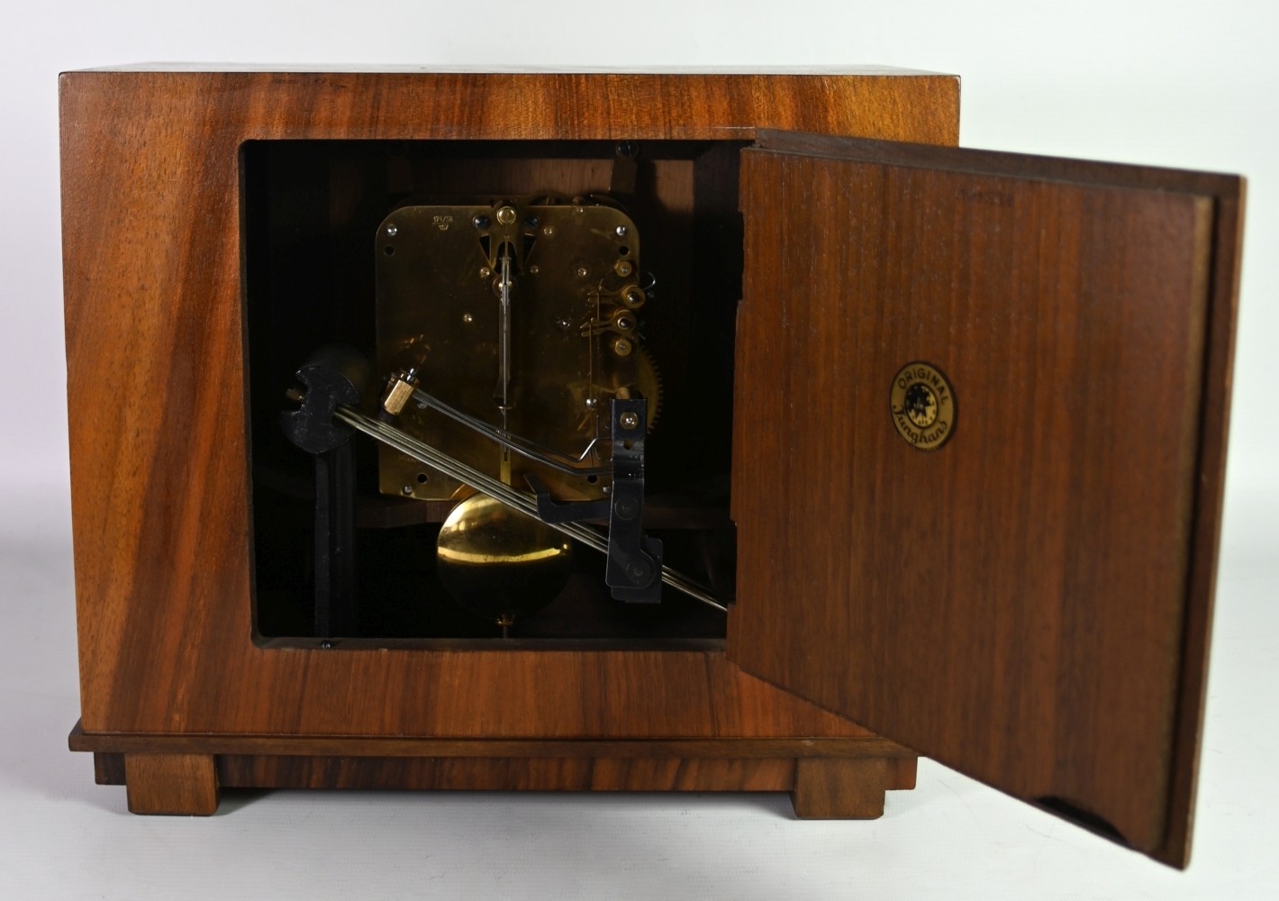 KOMMODENUHR auch Schreibtischuhr, Junghans, rechteckiges Holzgehäuse, viereckiges Zifferblatt verglast mit goldfarbenen arabischen Ziffern, Schlag auf drei Tonsaiten, rücks. Marke'' J. im Stern''darunter bez. ''Württemberg'', deutsch, um 1925, 26x39x14cm, *guter Zustand - läuft an*