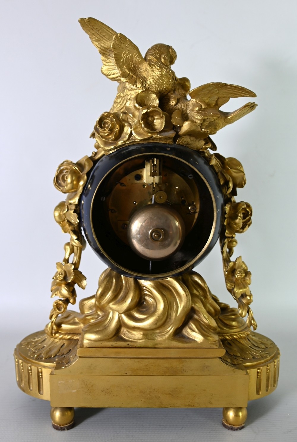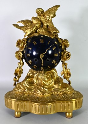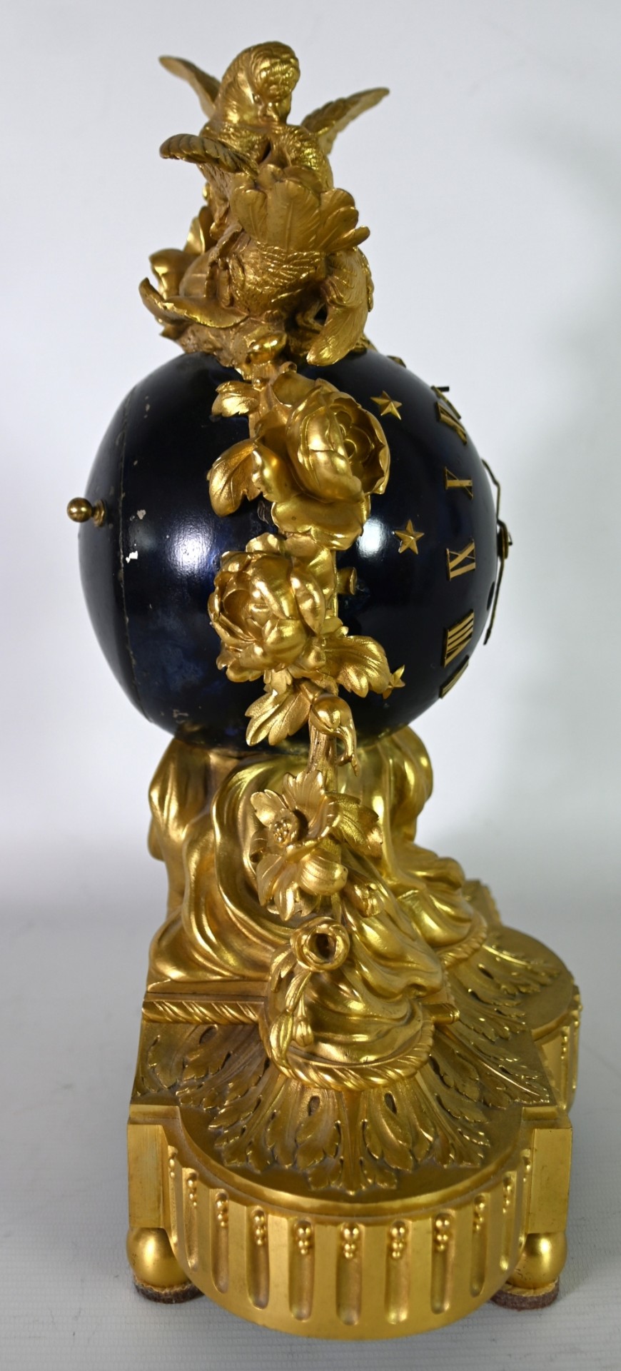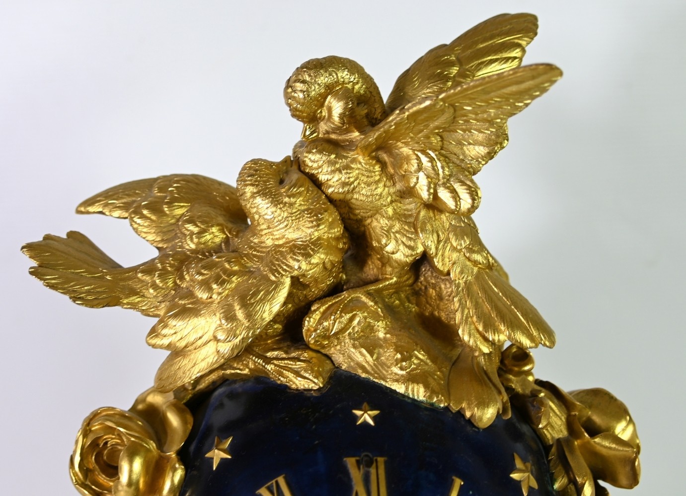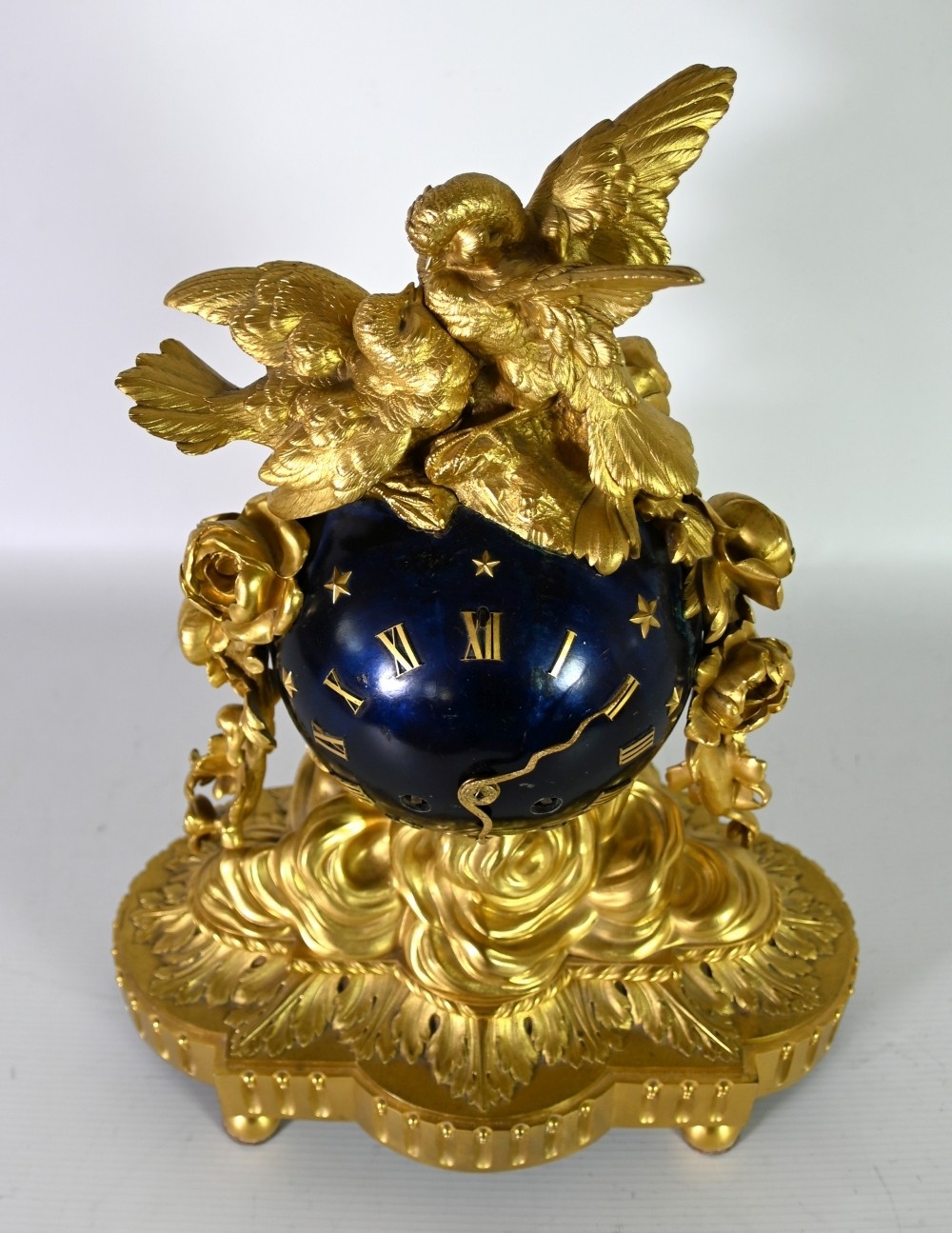 KOMMODENUHR zwei plastische Turteltauben aus vergoldeter Bronze, auf dunkel emailliertem Metall-Uhrengehäuse in der Form einer Weltkugel mit applizierten Sternen und römischen Ziffern, vergoldete Zeiger in Schlangenform, seitlich plastische Blütengirlanden, auf geschwungener Wolkenbasis mit Kugelfüßen, Bronze vergoldet, Werk bezeichnet: "Vincenti, Medaille d'Argent", Schlag auf Glocke, 7-Tagewerk, Pendule, wohl Frankreich 19. Jh., H 40cm, B 29 cm, T 15cm