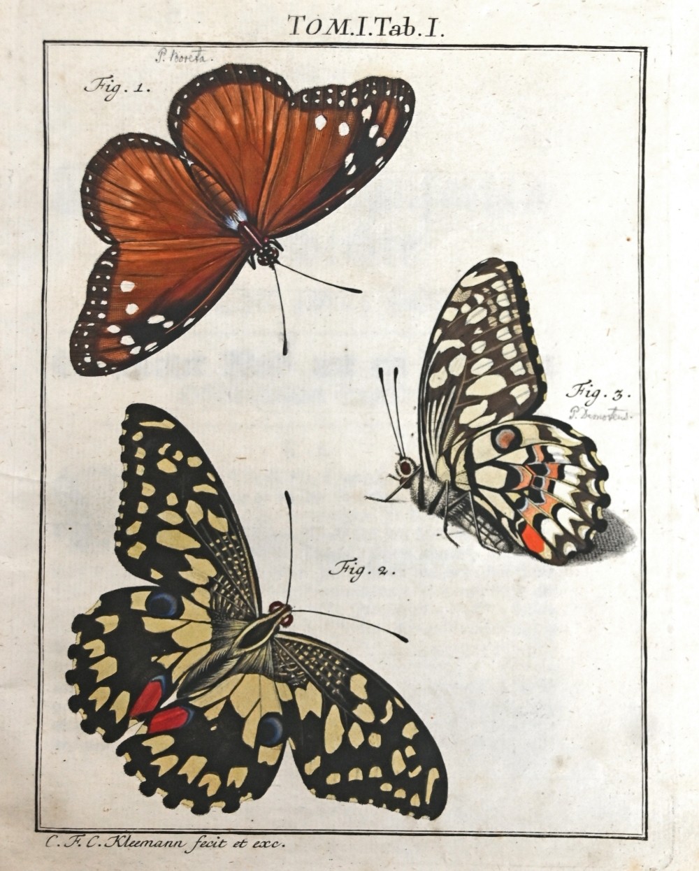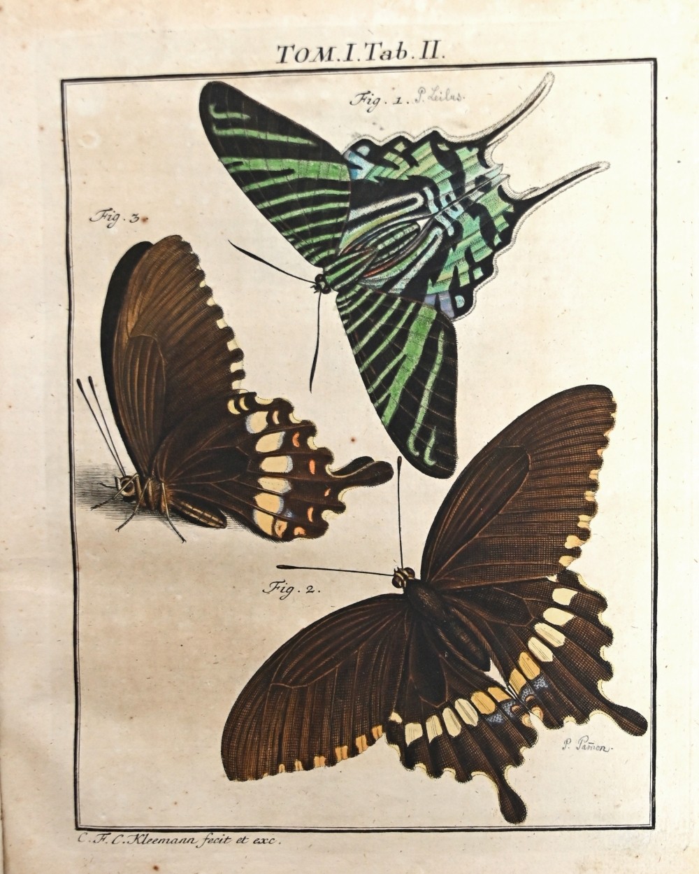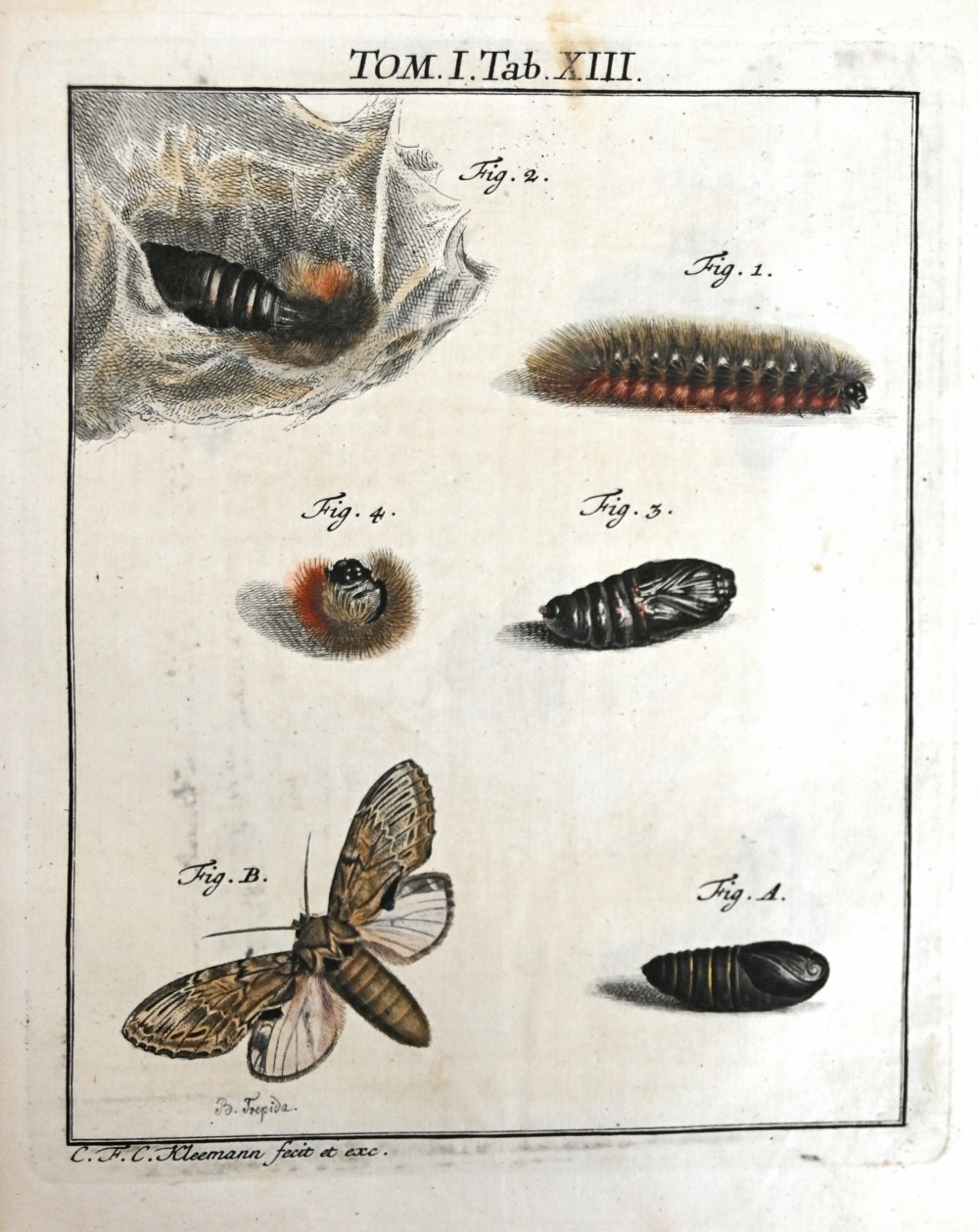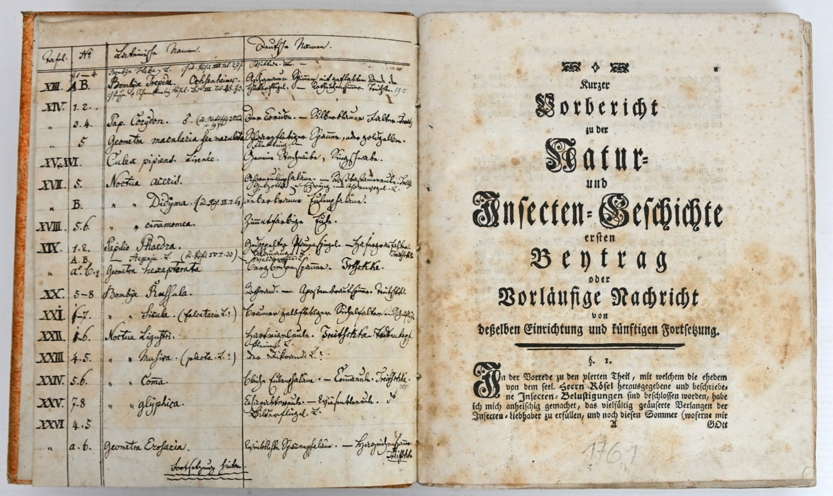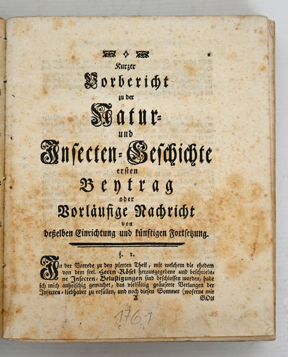 NATURGESCHICHTE ''Kurzer Vorbericht in der Natur- und Insecten-Geschichte'' (Kleemann) Band I. (1761) Gr.-8vo., Titel, 363 S., XLIII ganzseitige Tafeln mit kolorierten Kupferstichen von Insekten, gestochen von C. F. C. Kleemann, Vorsatzblätter mit Handschrift, Pappband mit starken Gebrauchsspuren am Rücken, Seiten leicht gebräunt *Der Vorbericht gehört zur Reihe der ''Insecten-Belustigung'' von Rösel von Rosenhof und August Johann*