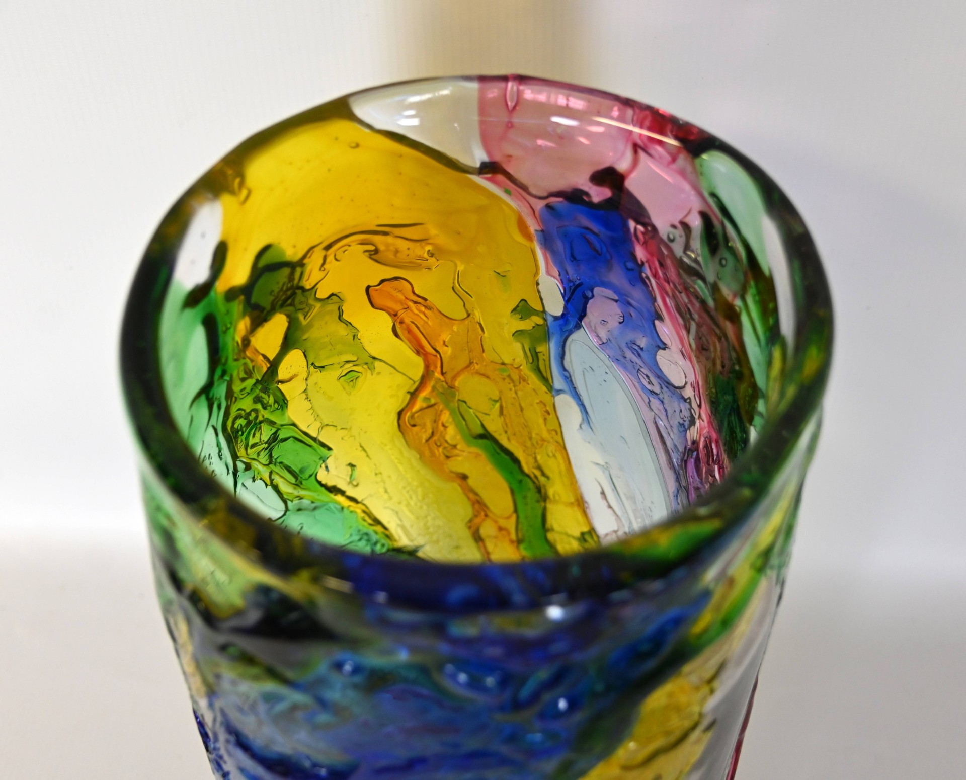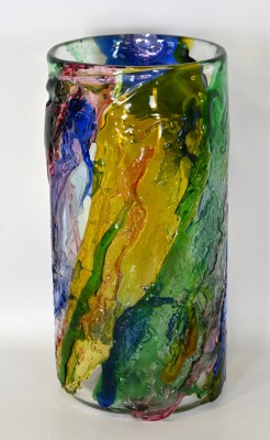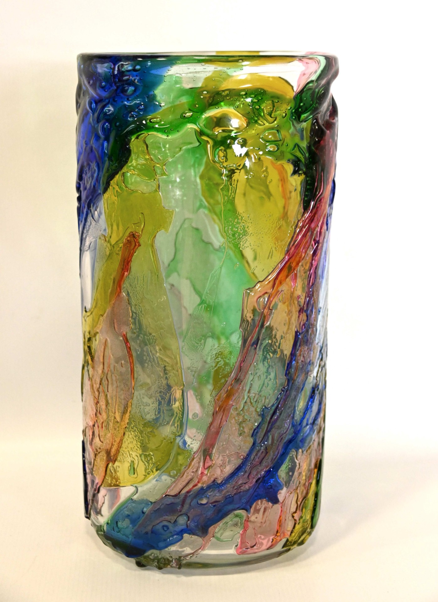 ONESTO KÜNSTLERVASE zylindrisch, transparentes Kristallglas in schwerer, dickwandiger Ausführung, umlaufend, amorph aufgeschmolzene, polychrome Farbfelder sowie Luftblasen-Einschlüsse, unterbodig Ritzsignatur Luigi Onesto, Murano, M Soly, H 36cm, D 17,5cm