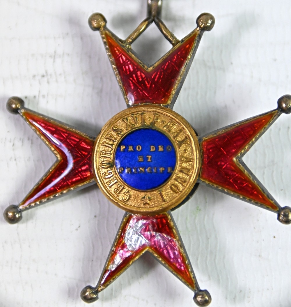 ORDEN DES HEILIGEN GREGOR DES GROßEN Ritterkreuz, Anfertigung der Fa. Tanfani & Bertarelli in Rom, Silber vergoldet, emailliert, Schäden in der roten Emaille auf Avers und Revers, am Band, zusammen mit Miniatur und 10 Knopflochrosetten in leicht beschädigtem Etui
