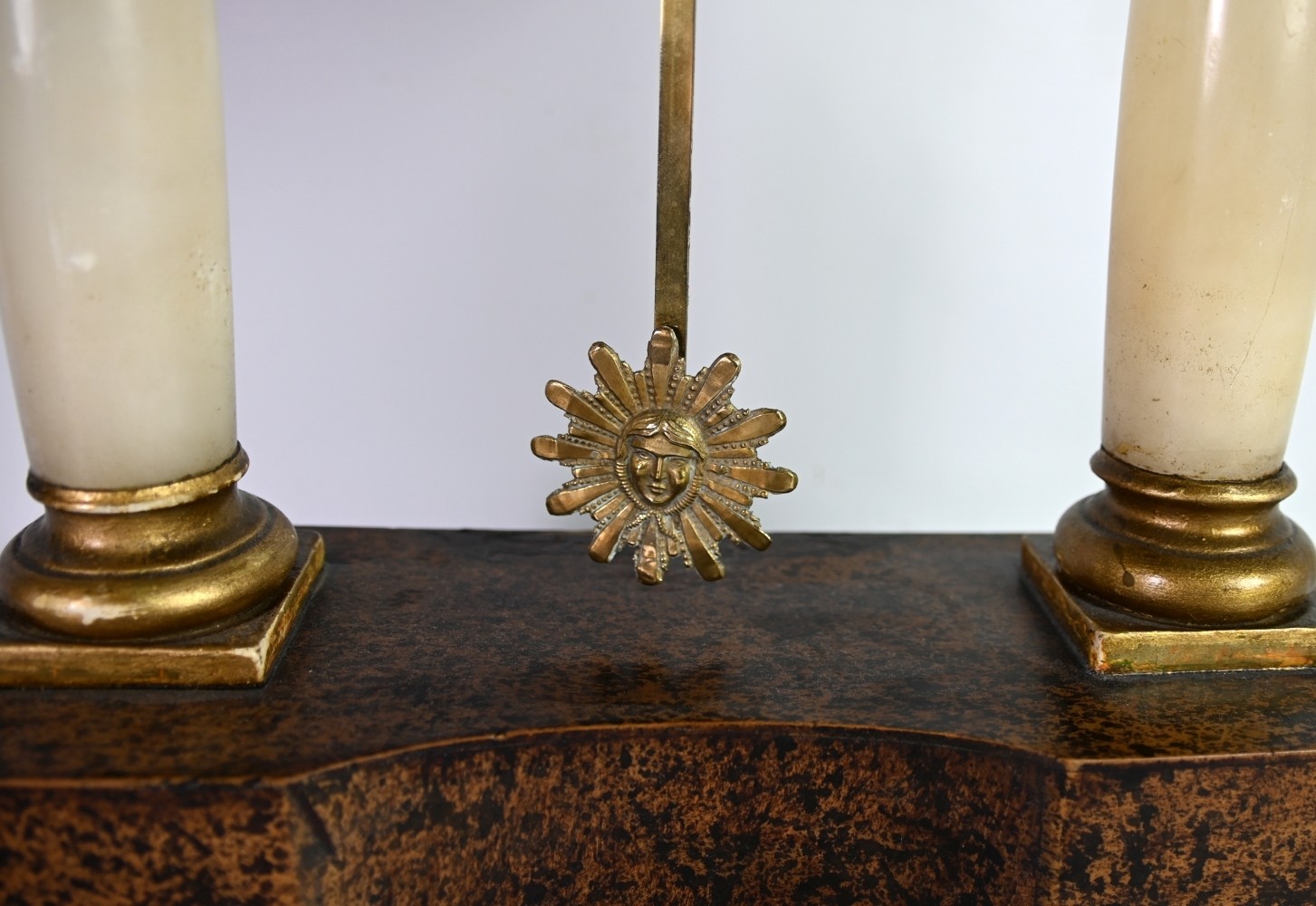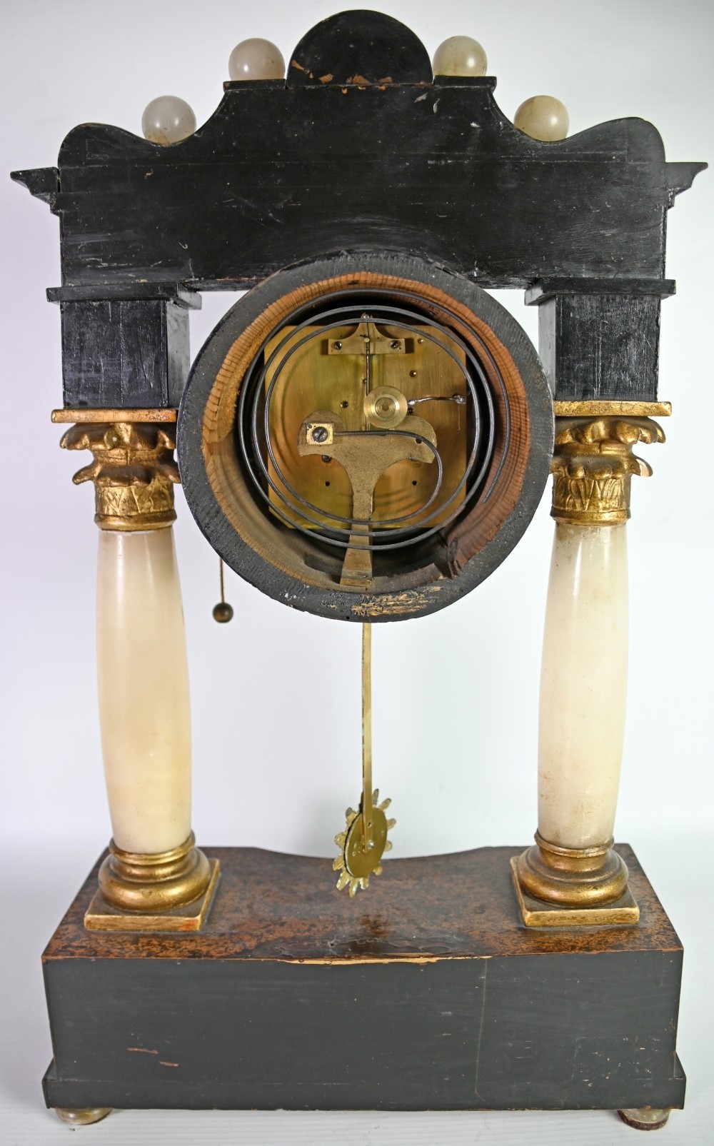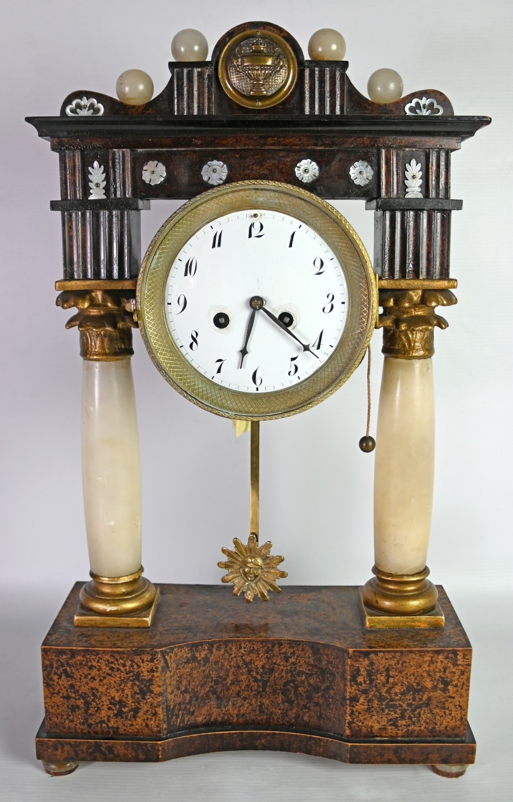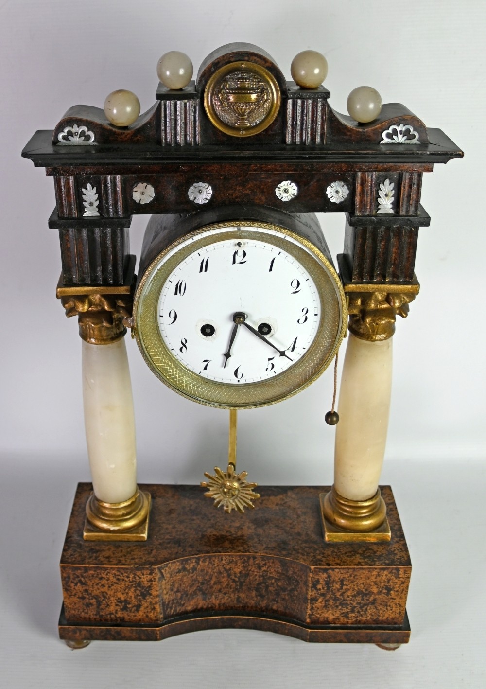 PORTALUHR architektonisch aufgebaut, zwei Alabastersäulen auf rechteckiger Basis, tragen den Architrav, an welchem die kleine Runduhr hängt, Holz, strukturiert und bemalt, dekoriert mit verschiedenen Kugeln und Blüten in Perlmutt, Emailzifferblatt mit arab. Ziffern, Schlag auf Tonfeder, vergoldetes Sonnenpendel, wohl Wien 19. Jh., 48x27x12cm, *Farben leicht berieben, Gehäusedeckel fehlt*