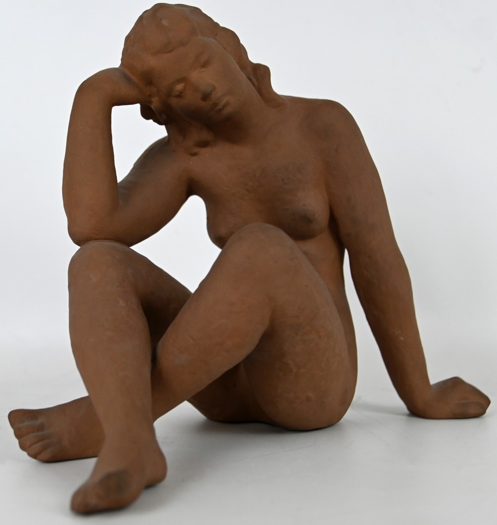 SITZENDER AKT Frau mit aufgestütztem Arm, verschränkten Beinen, brauner Ton, Stempel: Karlsruher Majolika, Nr. 5220, 15x32cm