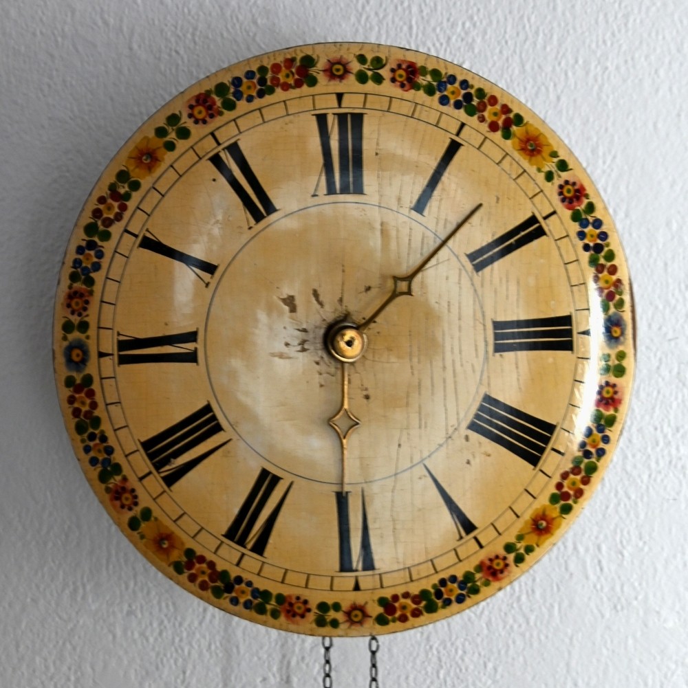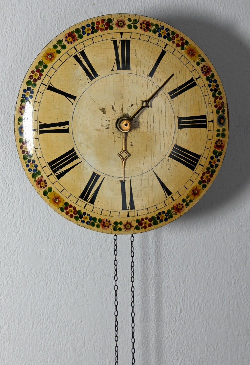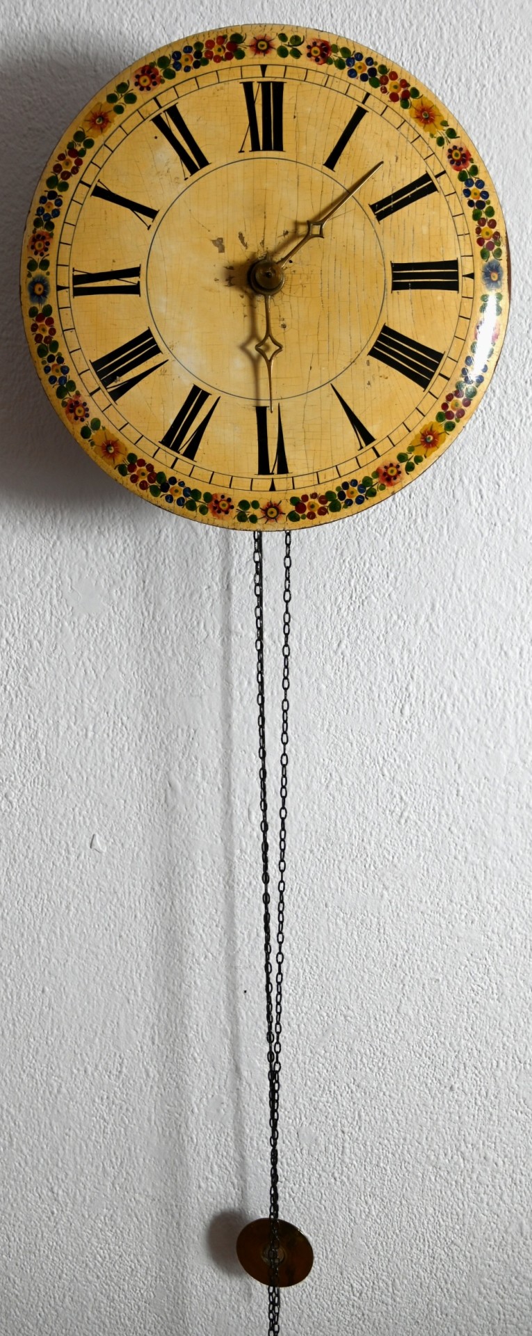 WANDUHR rundes Zifferblatt aus bemaltem Holz, mit römischen Ziffern und schmaler Blütengirlande als Randdekoration, typisches Schwarzwalduhrwerk, Schlag auf Tonfeder, Pendel und zwei Gewichte, Ende 19. Jh. *guter Zustand*