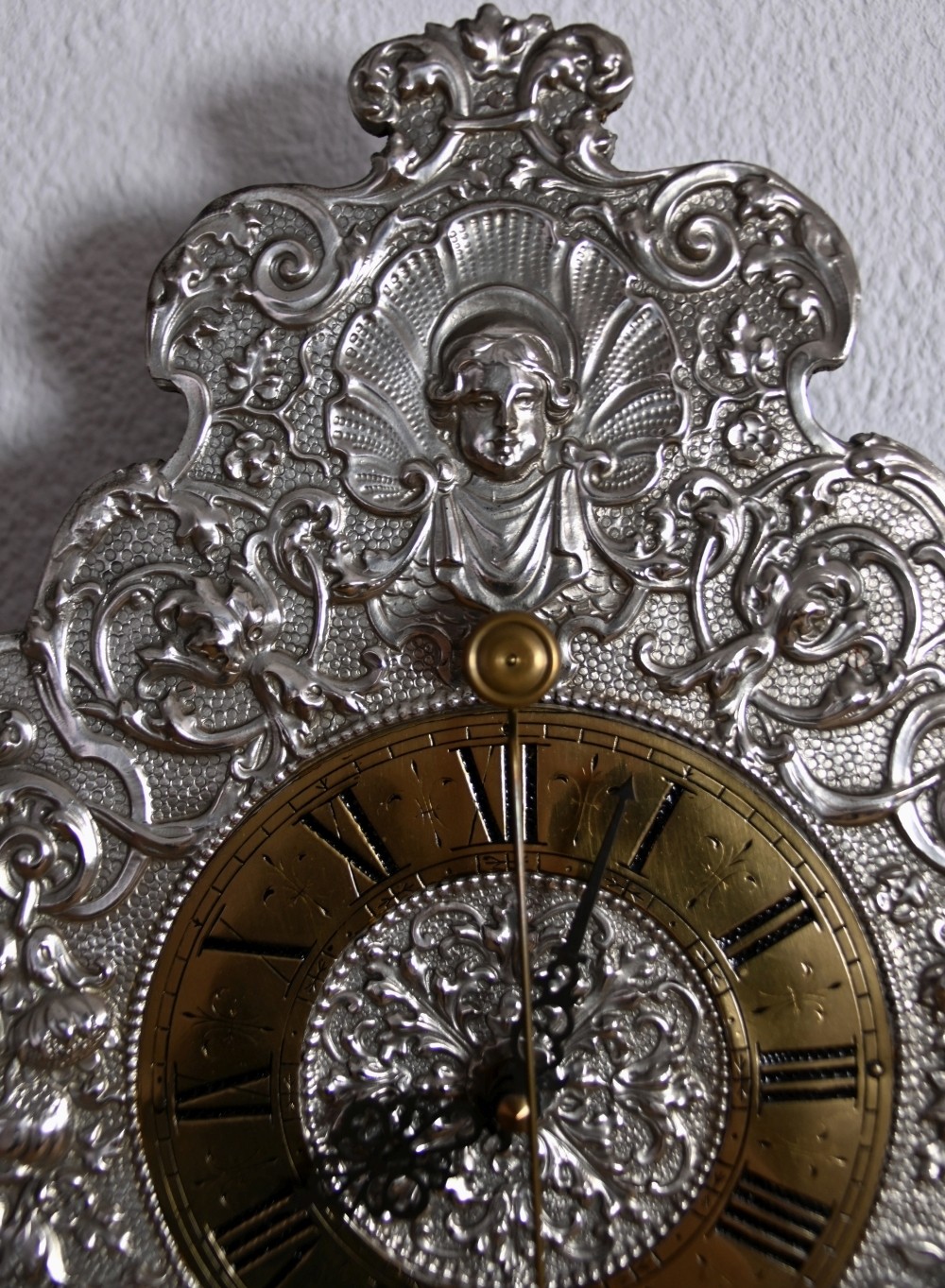 WANDUHR Telleruhr mit kurzem, schwingendem Vorderpendel, sogenannter Zappler, versilbertes Frontblech in Form einer Kartusche mit geprägtem Bandelwerk und Blütenzweigen, mittig ein Engelsköpfchen, zentrales Zifferblatt in Kupfer mit röm. Ziffern, neuzeitliches Uhrwerk mit Batteriebetrieb, Lauffähigkeit nicht überprüft, Nachbau einer süddeutschen Uhr des 18. Jh., 32x24x5cm