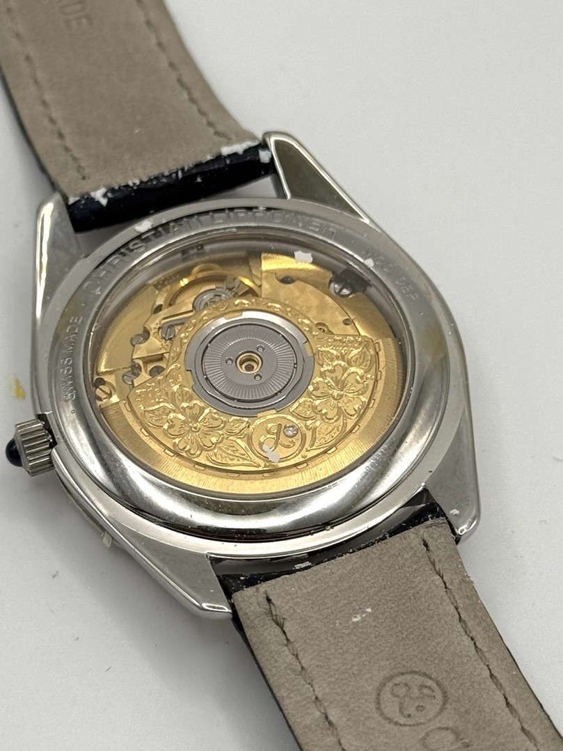 Los 319 - Christian Lippuner Armbanduhr, Unikat mit einem Gemälde des Künstlers Kurt Lauer als Ziffernblatt. Ref.CL2.95.1.5, Automatik, Stahlgehäuse, Uhrwerk von der Rückseite aus sichtbar. Mit Zertifikat und Holzschatulle. Stoff des Etuis löst sich.