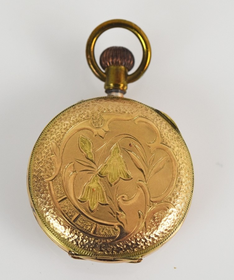 KLEINE TASCHENUHR Damentaschenuhr, Goldgehäuse 585, cremefarbenes Emailleziffernblatt mit römischen Ziffern, Hilfspunkte für Sekunden, fein ziselierte Goldzeiger, seitlich und Rückdeckel ziseliert und reich verziert, rückseitig Motiv einer Blume mit zwei offenen und einer geschlossenen Blüte, im Rückdeckel nummeriert 3439, Gravur auf Werkdeckel ''Cylindre 10 Rubis'', D gesamt 2,2cm, läuft an