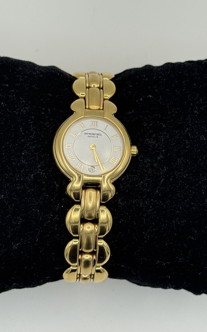 Raymond Weil Damenarmbanduhr, Geneve, Wasserresistent. Ziffernblatt in weiß mit römischen Ziffern und Datumsanzeige auf sechs Uhr. Verlängerungsglied liegt bei. Funktion ungeprüft.