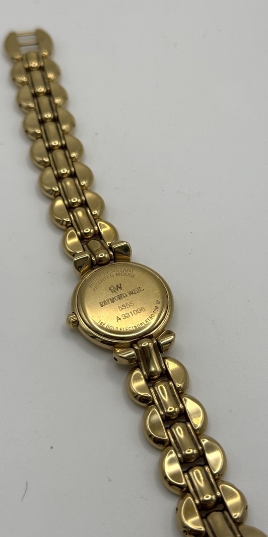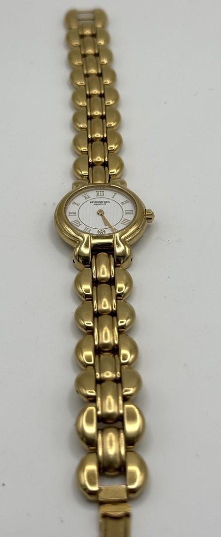 Los 336 - Raymond Weil Damenarmbanduhr, Geneve, Wasserresistent. Ziffernblatt in weiß mit römischen Ziffern und Datumsanzeige auf sechs Uhr. Verlängerungsglied liegt bei. Funktion ungeprüft.