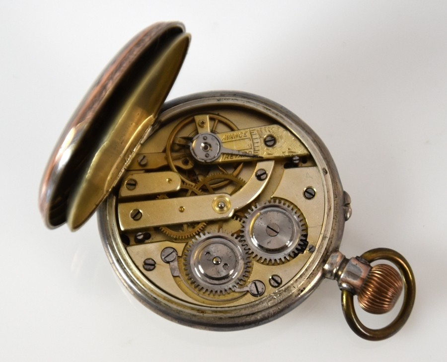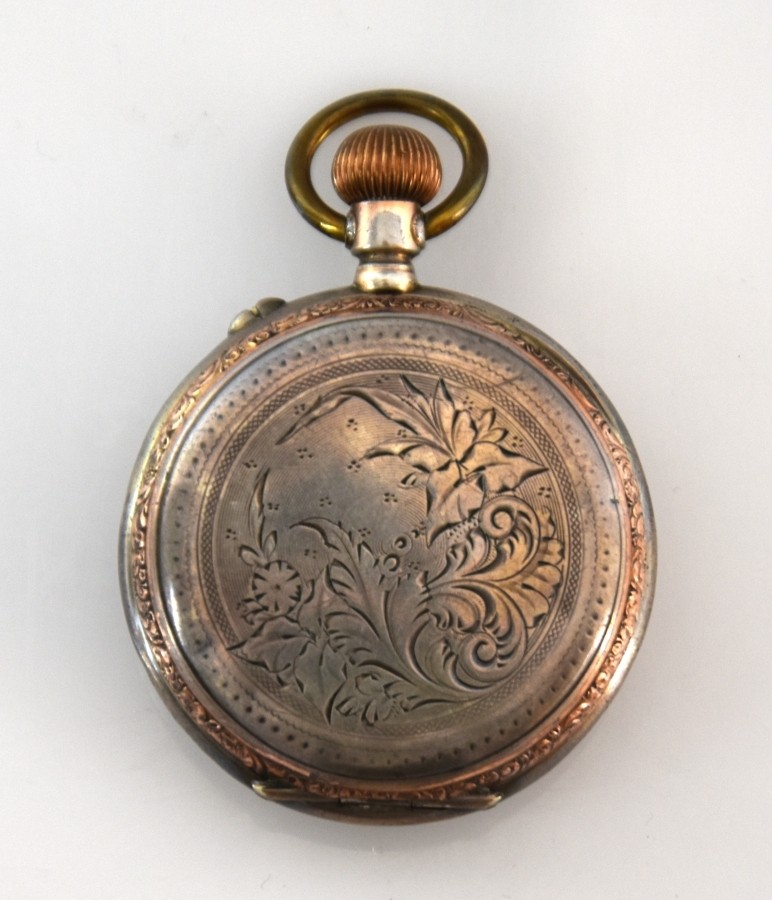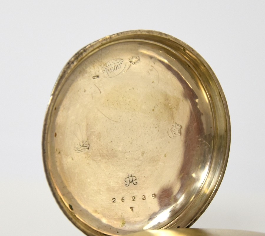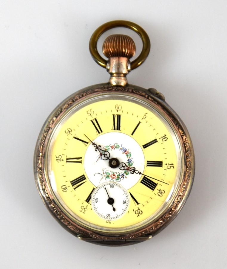 TASCHENUHR Remontoir, Silbergehäuse 800, Emailleziffernblatt in Creme und Weiß mit römischen Ziffern, kleine Sekunde/6, Hilfsblatt für Sekunden, feine ziselierte Goldzeiger, mittig kleine colorierte Blumenranke, Rückdeckel mit reicher Ziselierung und Blumen, seitlich ebenso verziert, Rückdeckel graviert: ''Remontoir Cylindre 6 Rubis'' und nummeriert 26239, D gesamt 4,5cm, läuft an