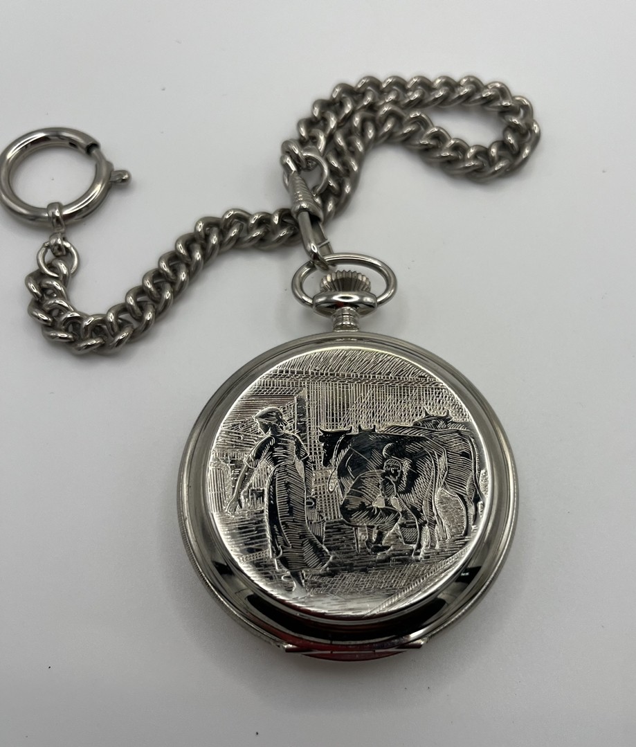 Rückseitige Gravur verweist mit der Darstellung zweier Bauern im Kuhstall auf eine Uhr, die zu einer Tracht getragen wurde.