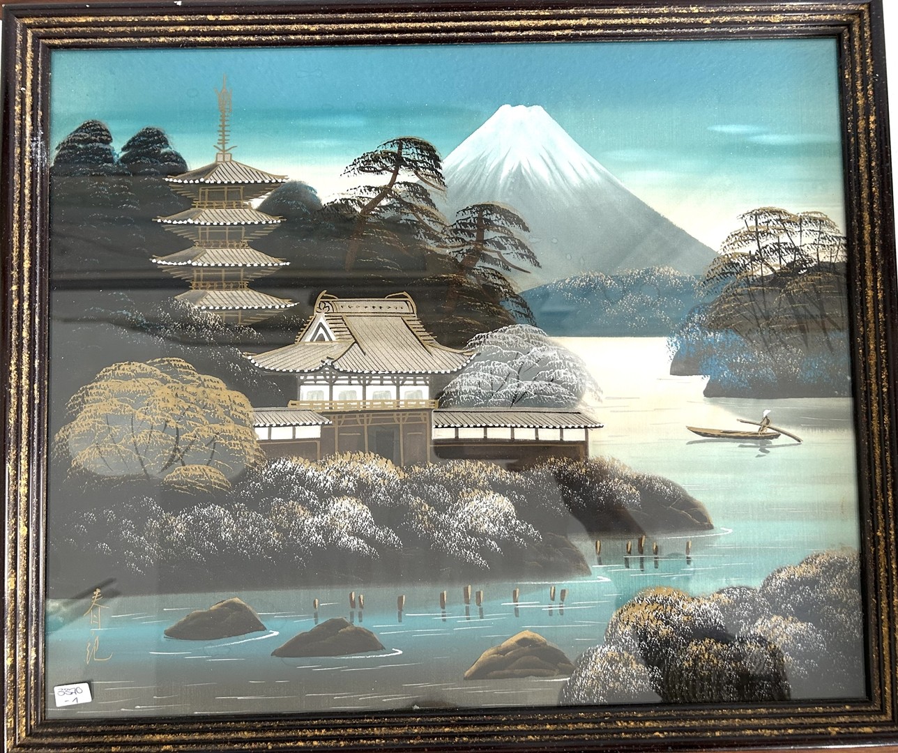 Los 5 - Anonym (20. Jahrhundert) Blick auf den Vulkan Fuji, Asiatische Seidenmalerei.