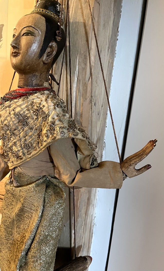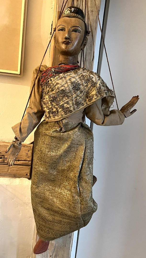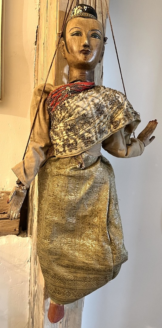 Los 7 - Thailändische Marionette, 19./20. Jahrhundert. Schmuckvolle Marionette mit bemaltem Gesicht. Das Gewand besteht aus prachtvoll besticktem Stoff und vervollständigt die detaillierte Ausarbeitung.