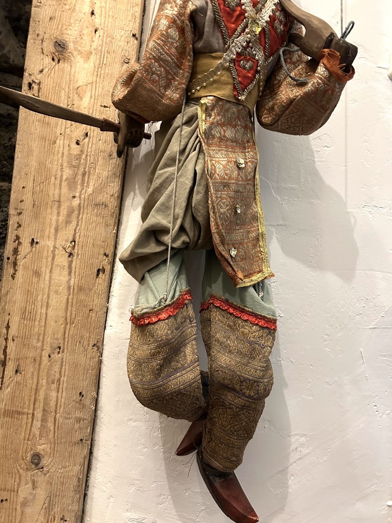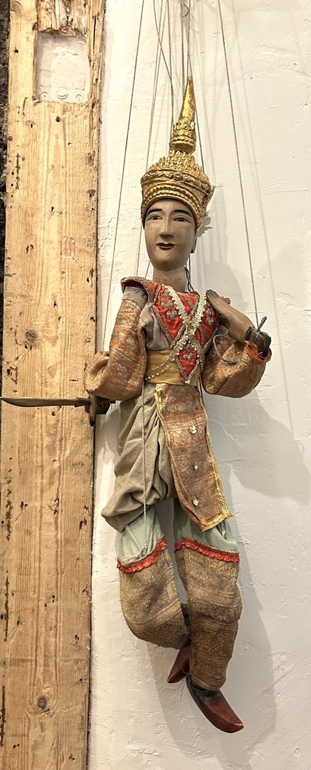 Schmuckvolle Marionette mit bemaltem, menschlichen Gesicht. Das Gewand besteht aus prachtvoll besticktem Stoff und vervollständigt die detaillierte Ausarbeitung. Vermutlich die Darstellung eines Ritters, da sich in der rechten Hand ein Dolch befindet. Erinnert an Tempeltänzer der südostasiatischen Region.