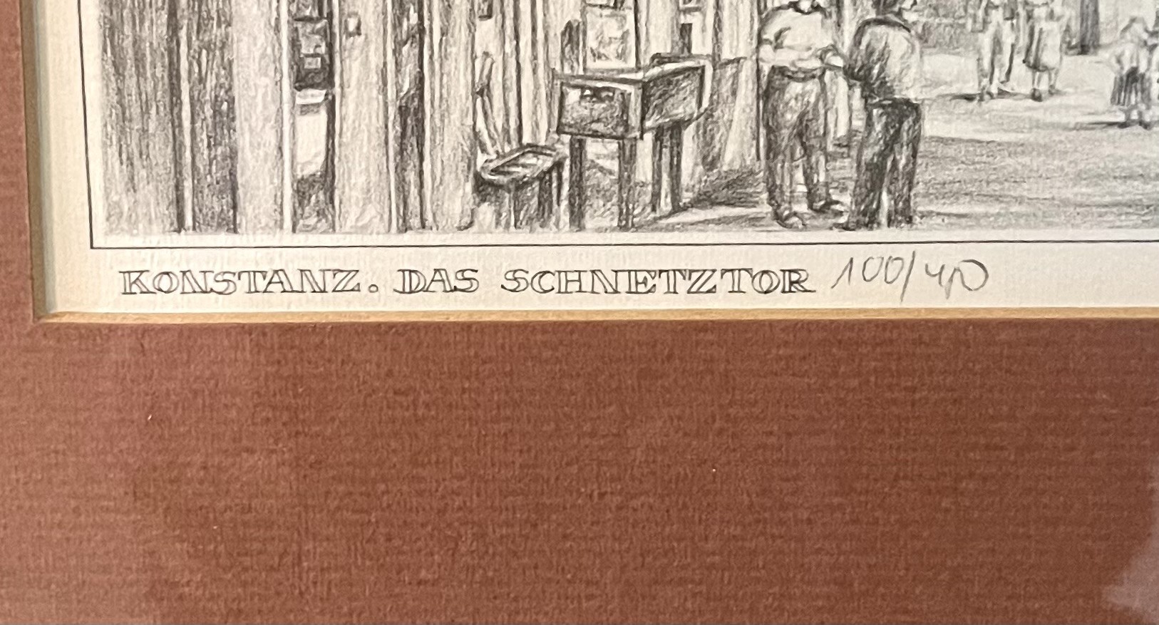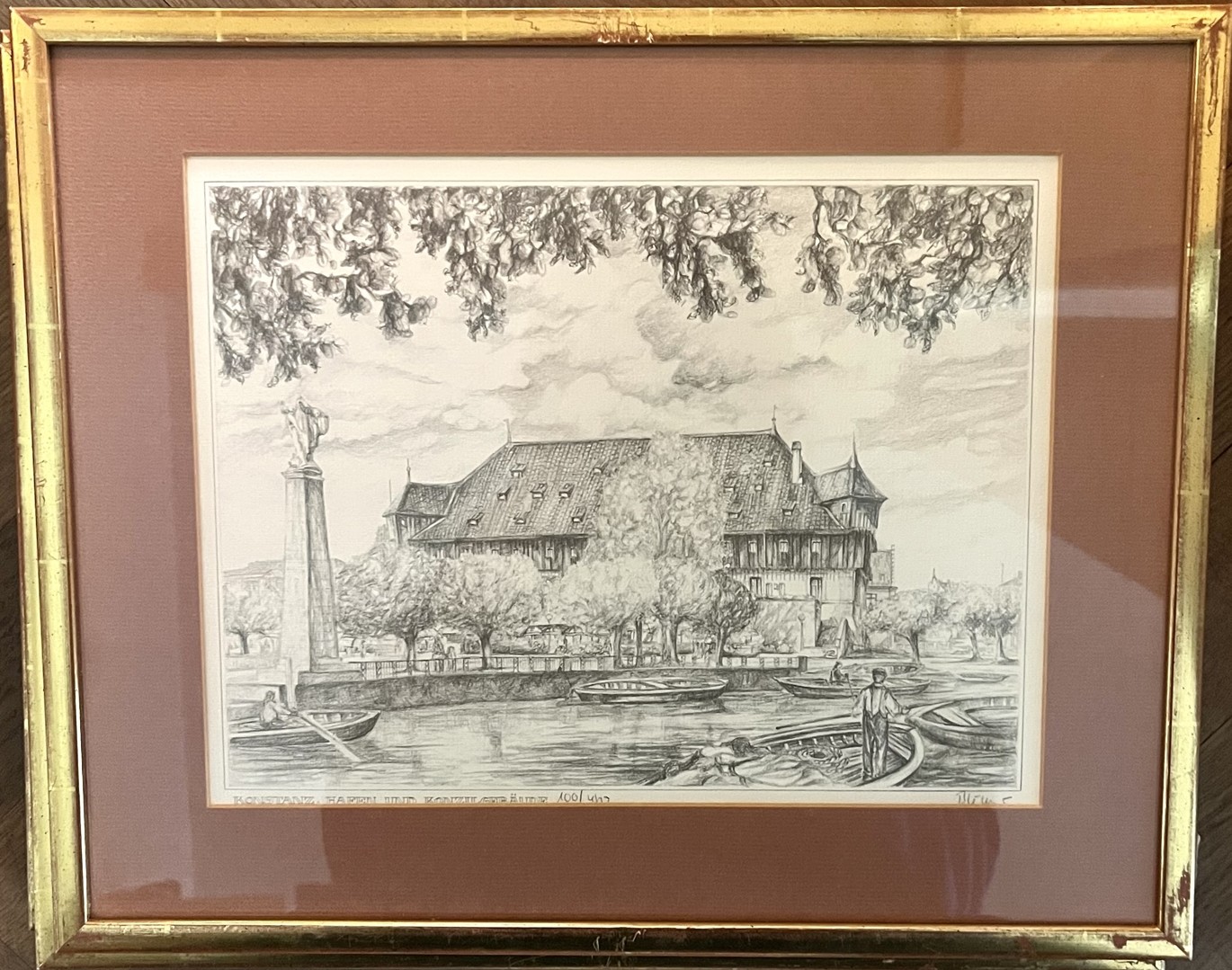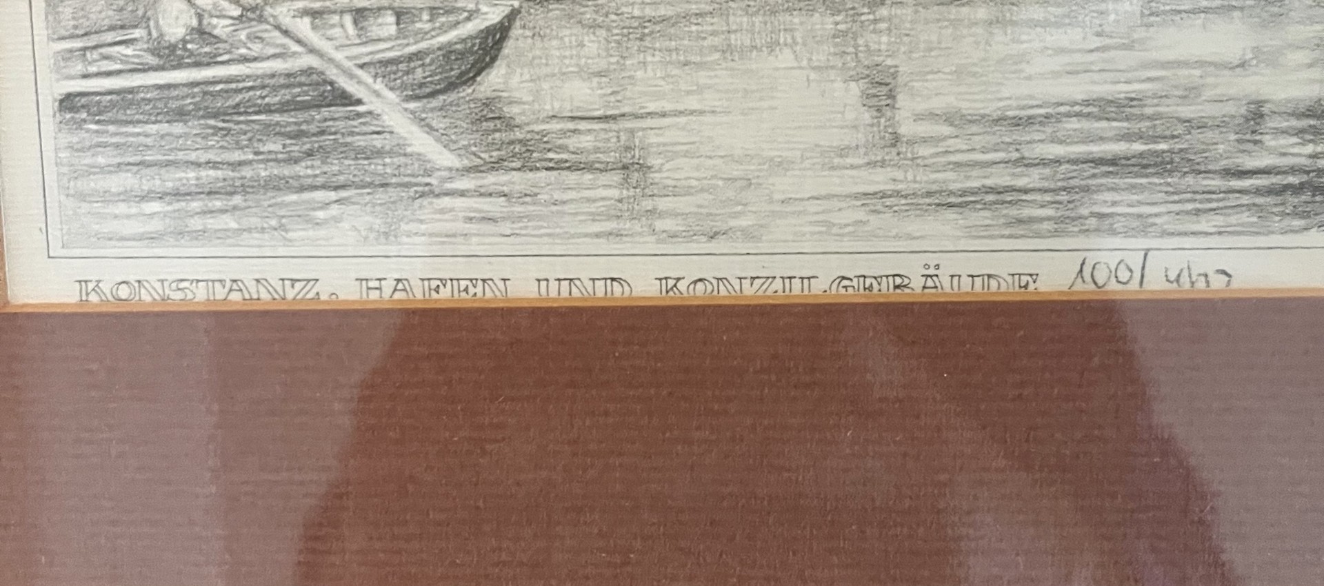 Blömer, Irene (20. Jahrhundert), Konstanz, sechs Original-Lithographien. Darunter: "Konstanz. Die Alte Dompropstei", "Konstanz. Hafen und Konzilgebäude", "Konstanz. Das Schnetztor", "Konstanz. Das Rathaus", "Konstanz. Blick auf Münster und Inselhotel" und "Konstanz. Das Konstanzer Münster".