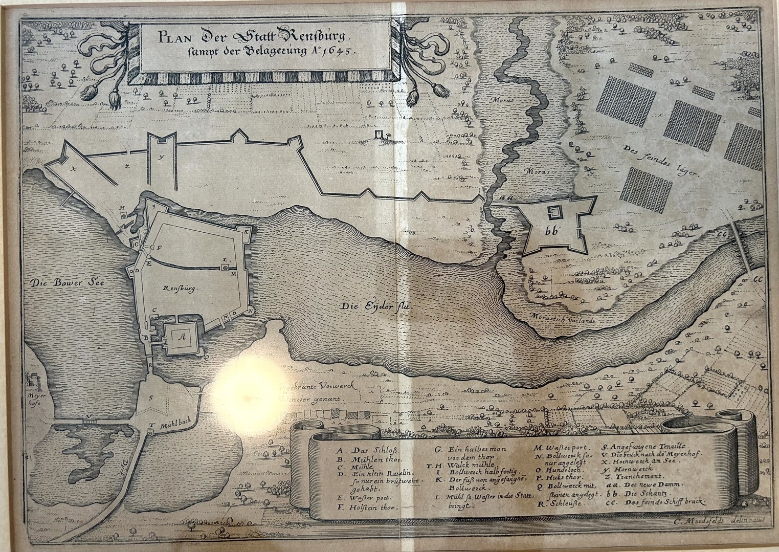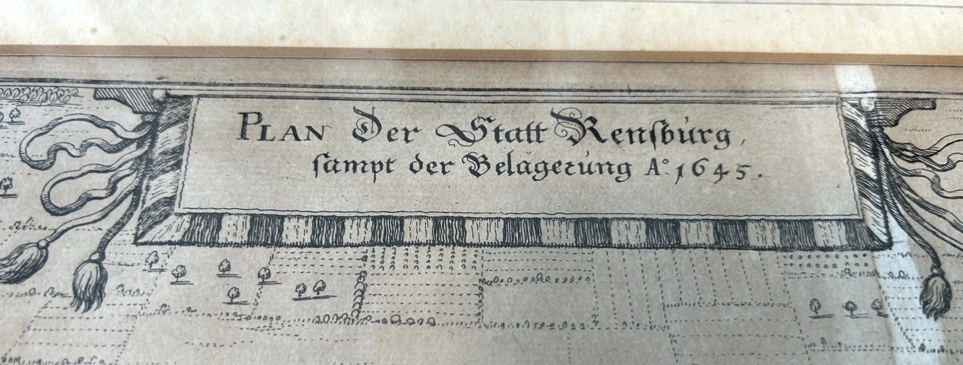 Der Kupferstich zeigt den Plan der Stadt Rendsburg und den Kampf der Belagerung 1645.