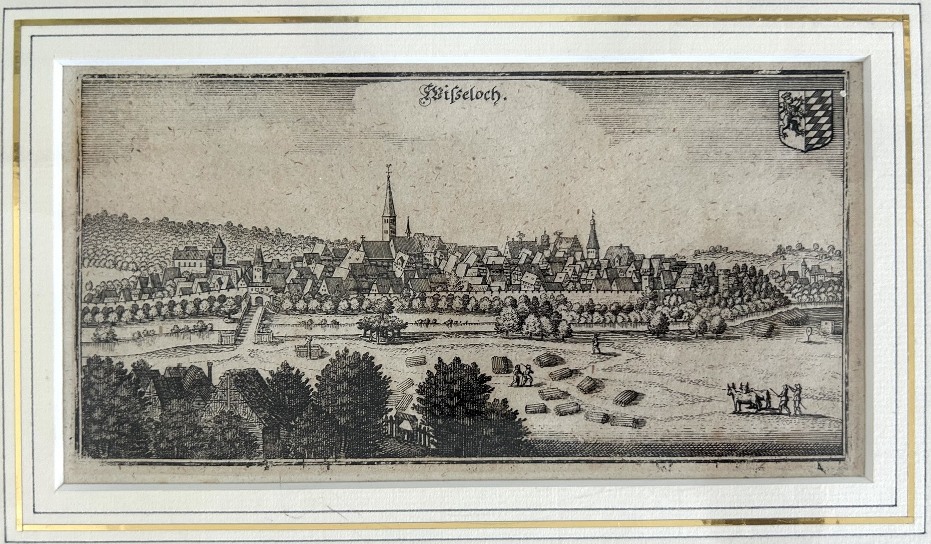 Der detaillierte Kupferstich von Merian zeigt eine Stadtansicht von Wiesloch, welches von Feldern und Hügeln umgeben ist. Das Stadtwappen wird auf dem rechten oberen Bildgrund abgezeichnet.