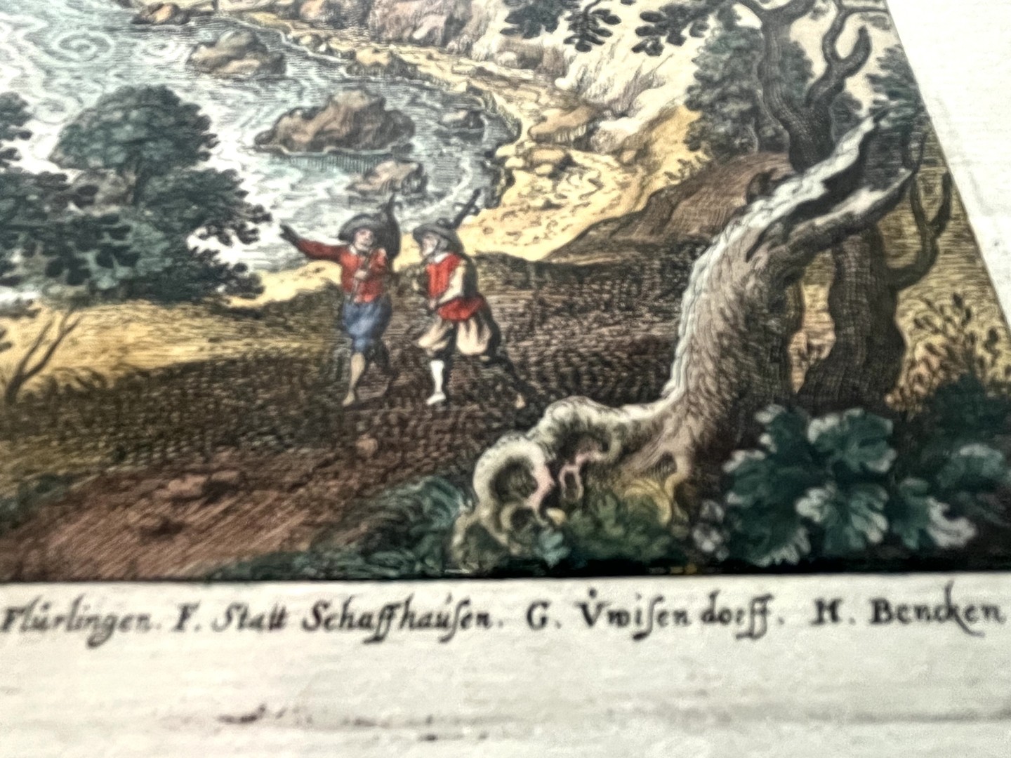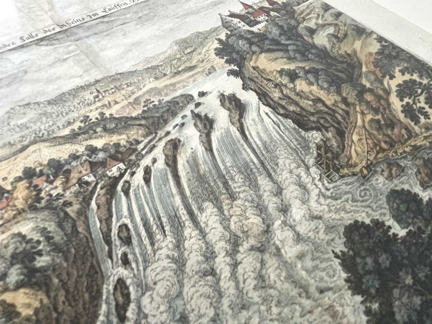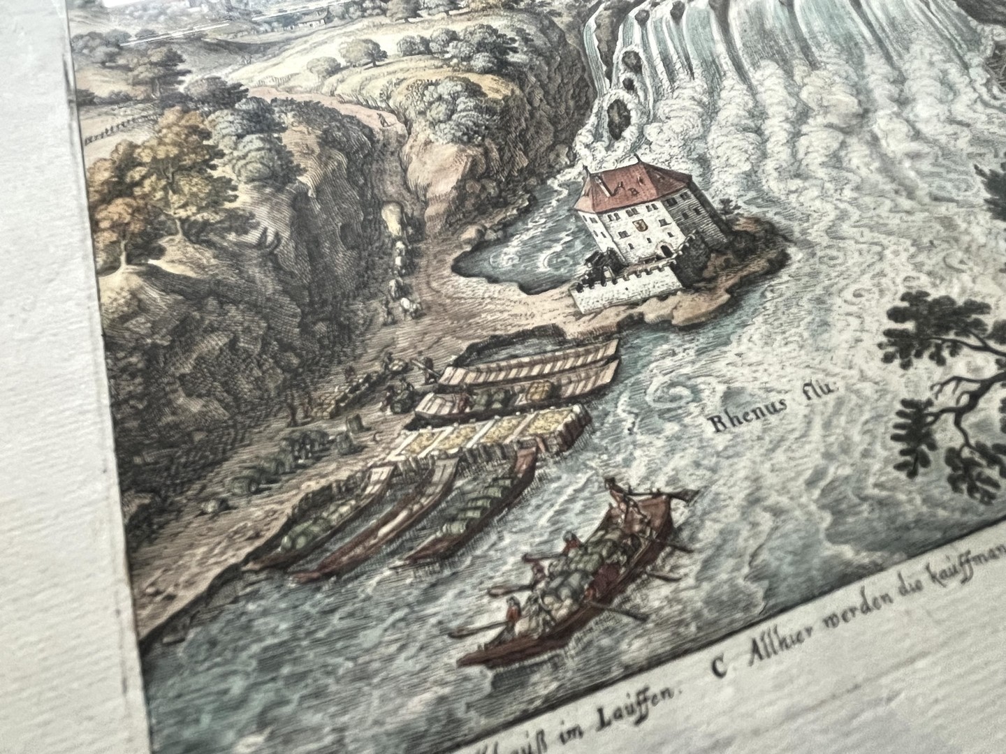Rheinfall Schaffhausen, von Matthäus Merian d.Ä. (1593-1650), altkolorierter Kupferstich, 1638.