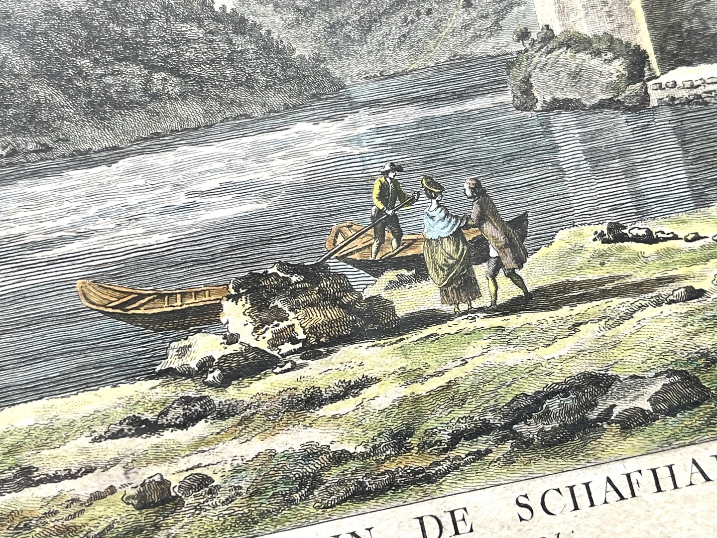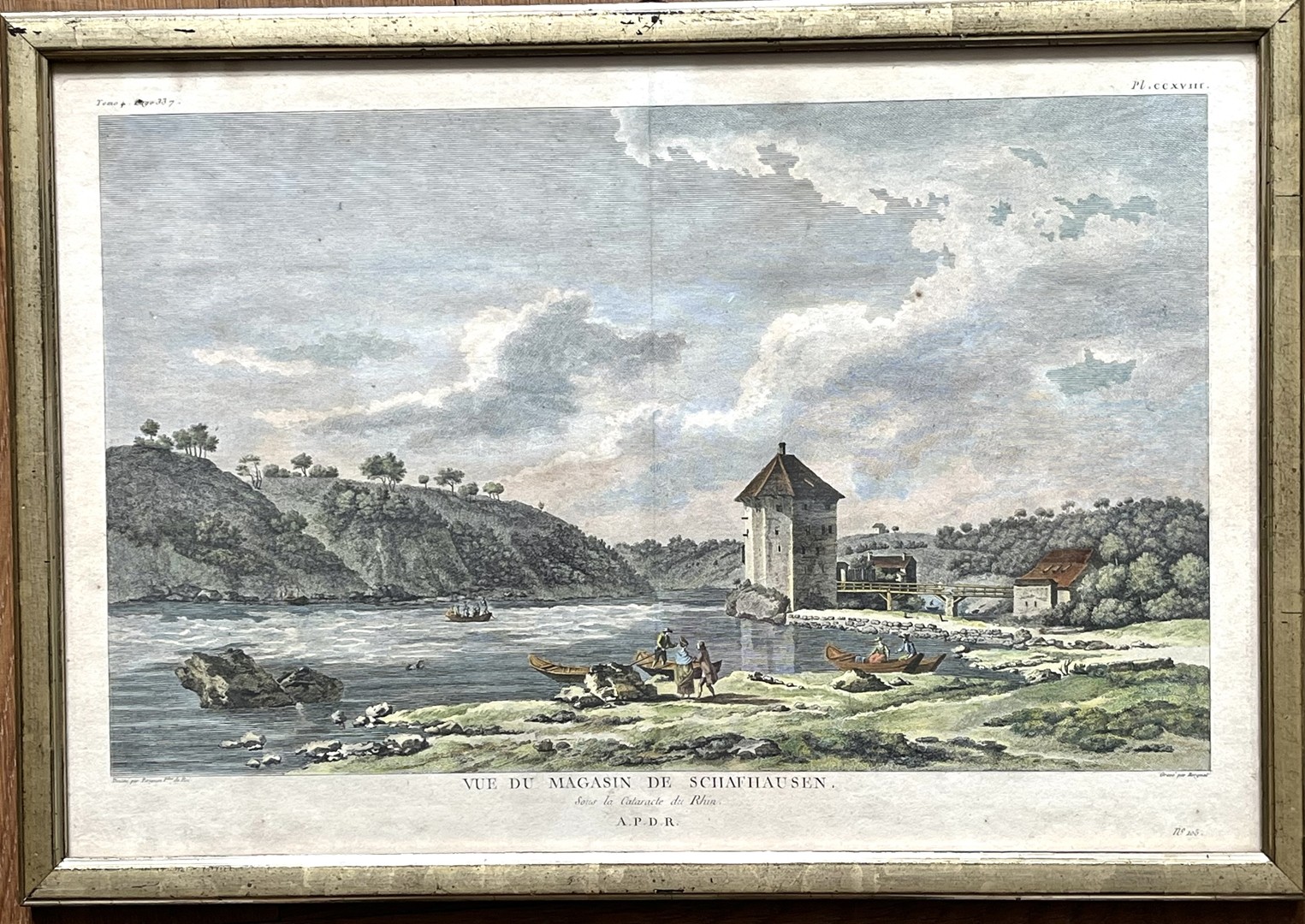 Rheinfall Schaffhausen, "Vue du Magasin de Schafhausen", 1780, Bergnet/Perigon, kolorierter Kupferstich. Aus dem Buch von Beat Fidel Zurlauben, Seite 337. Das Blatt stellt die Sicht vom Rheinfall auf den Topf des Rheinfalls mit dem dahinterliegenden Waren- und Fischerhafen dar. Von dort starten auch die Aussichtsboote. Mittelfalz, Wenig Flecken.