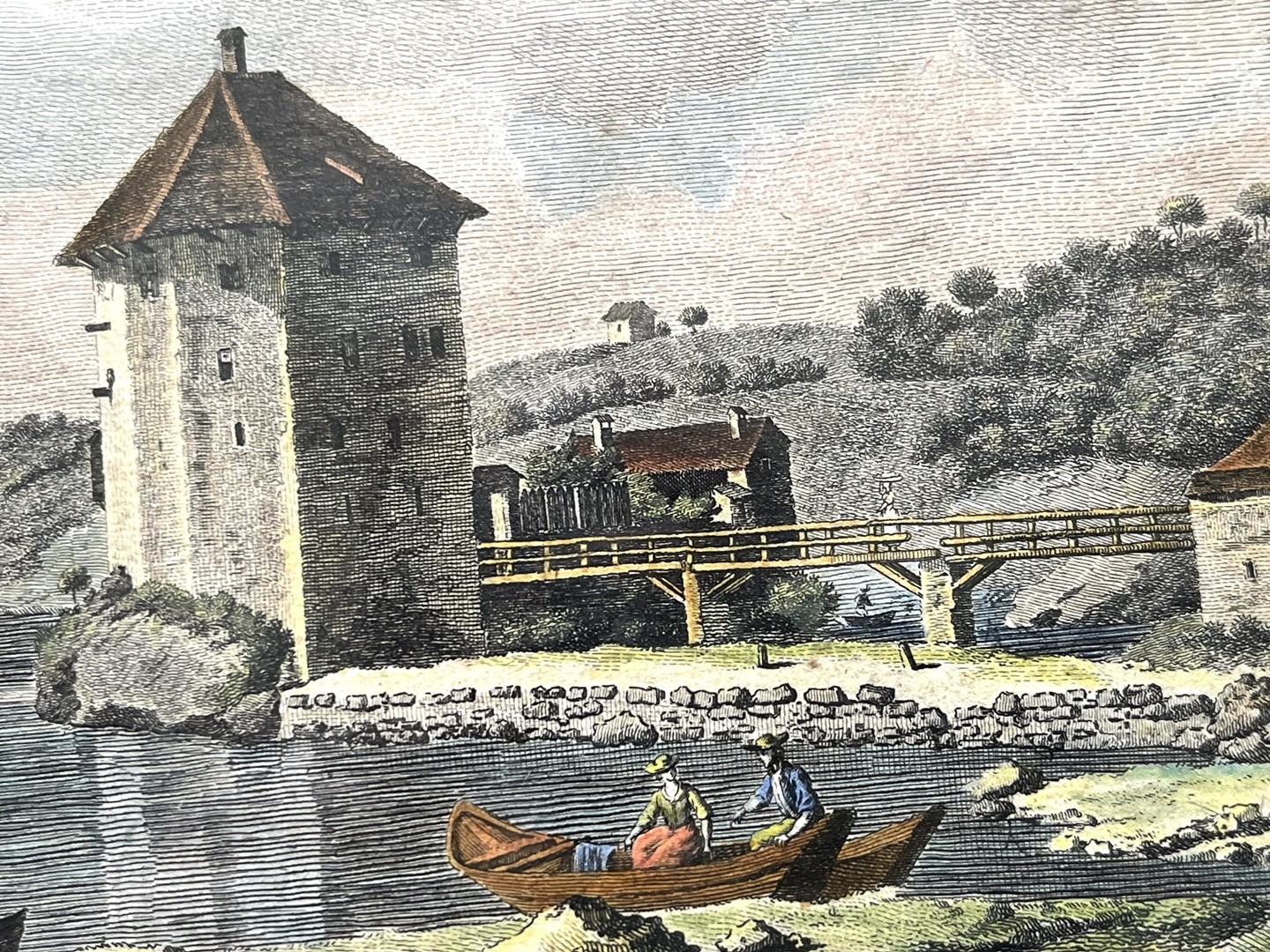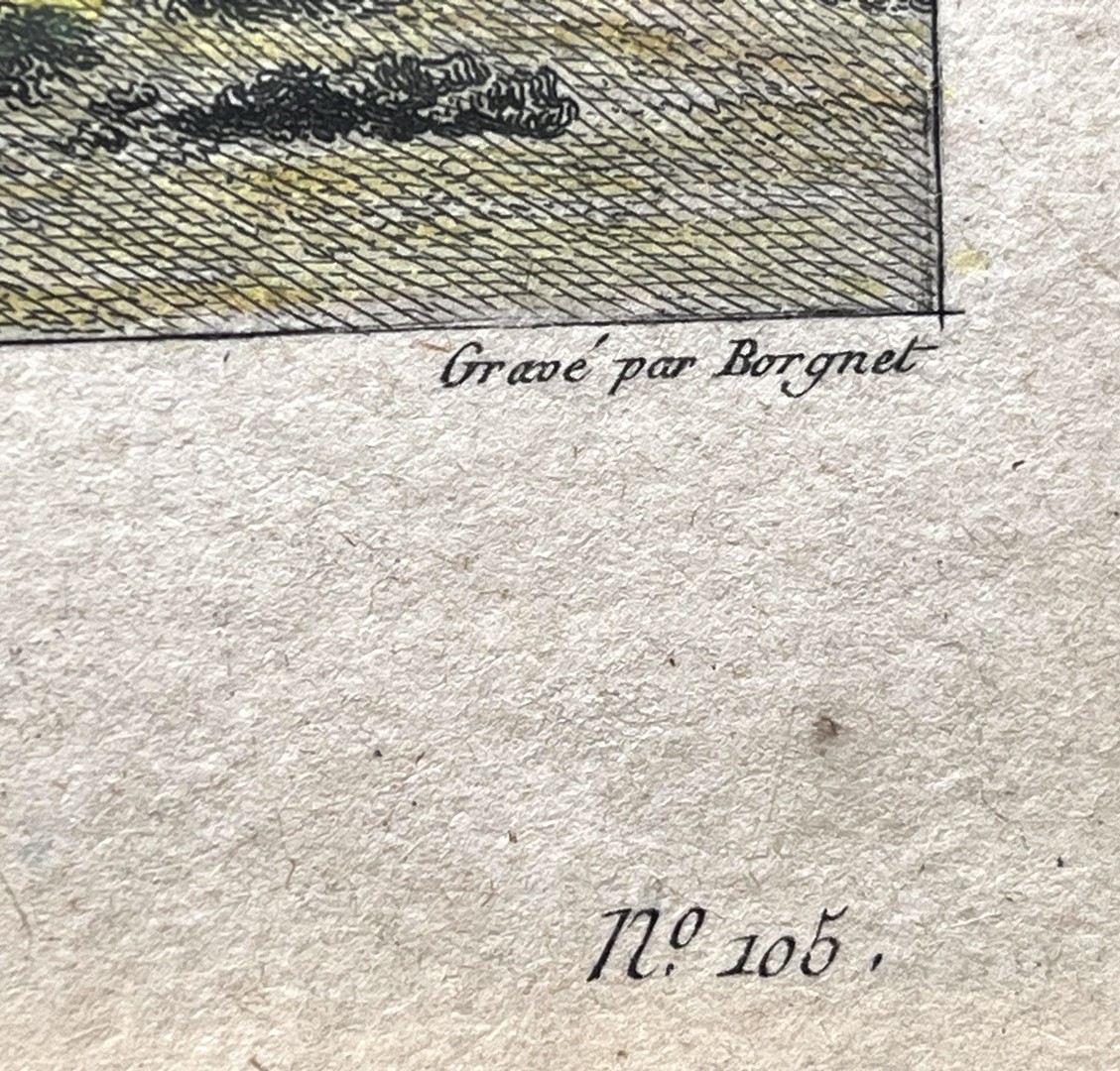 Los 371 - Rheinfall Schaffhausen, "Vue du Magasin de Schafhausen", 1780, Bergnet/Perigon, kolorierter Kupferstich. Aus dem Buch von Beat Fidel Zurlauben, Seite 337. Das Blatt stellt die Sicht vom Rheinfall auf den Topf des Rheinfalls mit dem dahinterliegenden Waren- und Fischerhafen dar. Von dort starten auch die Aussichtsboote. Mittelfalz, Wenig Flecken.