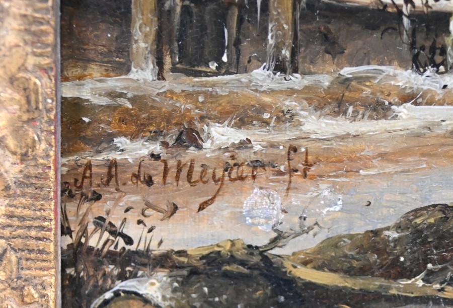 DE MEYER Antonij Andreas (1806 Den Haag, Niederlande - 1867 ebd.) ''Winterlandschaft'', mit gefrorenem Gewässer, Eisläufern und Pferd, links Reethäuser und blattlose Bäume, an beiden Ufern Mühlen, rechts im Hintergrund ein Kirchenbau, Ölgemälde auf Leinwand, 29,5x49,5cm, R *De Meyer war Schüler des Landschaftsmalers Andreas Schelfhout. Sie reisten in den 1830er Jahren zusammen nach Deutschland. De Meyer malte hauptsächlich holländische Landschaften mit Seen, Wäldern und Mühlen, die von Zeit zu Zeit mit Figuren und Häusern angereichert werden. Darüber hinaus malte er vielfach belebte Winterlandschaften mit Schlittschuhläufern.*