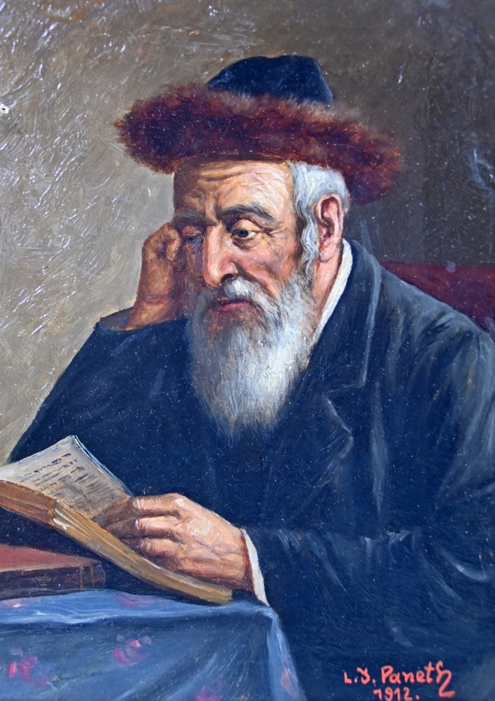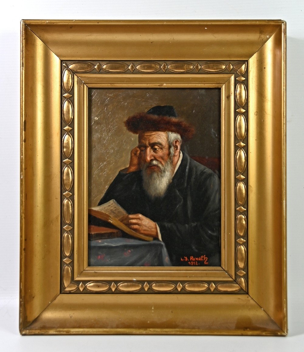JUDAVICS-PANETH Lasarre (1870 Königsberg - nach 1912) ''Portrait eines Rabbiners'', der lesend an einem Tisch sitzt, Portrait im Dreiviertelprofil, Ölgemälde, rechts unten signiert und 1912 datiert, 20,5x15cm (Abb.), 34,5x29,5cm (Rahmen)