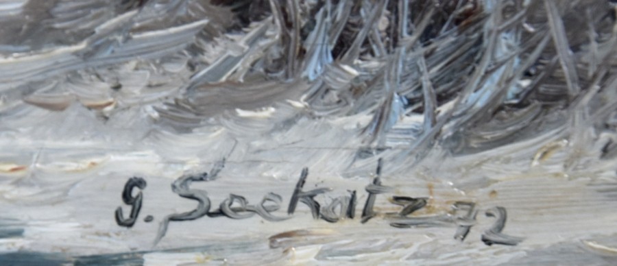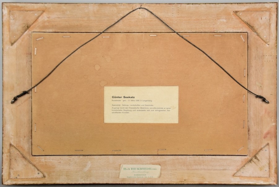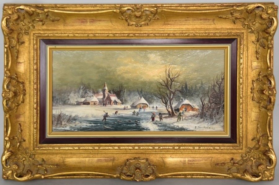 SEEKATZ Günter (1928 Langenberg) ''Winterlandschaft mit Eisläufern'' Ölgemälde auf Platte, rechts unten signiert und (19)72 datiert, 14,5x29cm, Prunkrahmen *Seekatz knüpfte frühzeitig Kontakte mit Mitgliedern der Düsseldorfer Malschule. Er besuchte die Folkwang-Kunst-Hochschule und studierte an den Akademien in München u. Düsseldorf. Seit den 1960er Jahren Einzelausstellungen in Deutschland und den USA.*