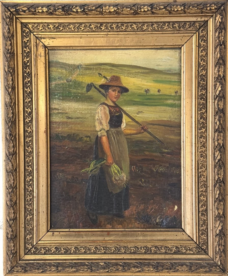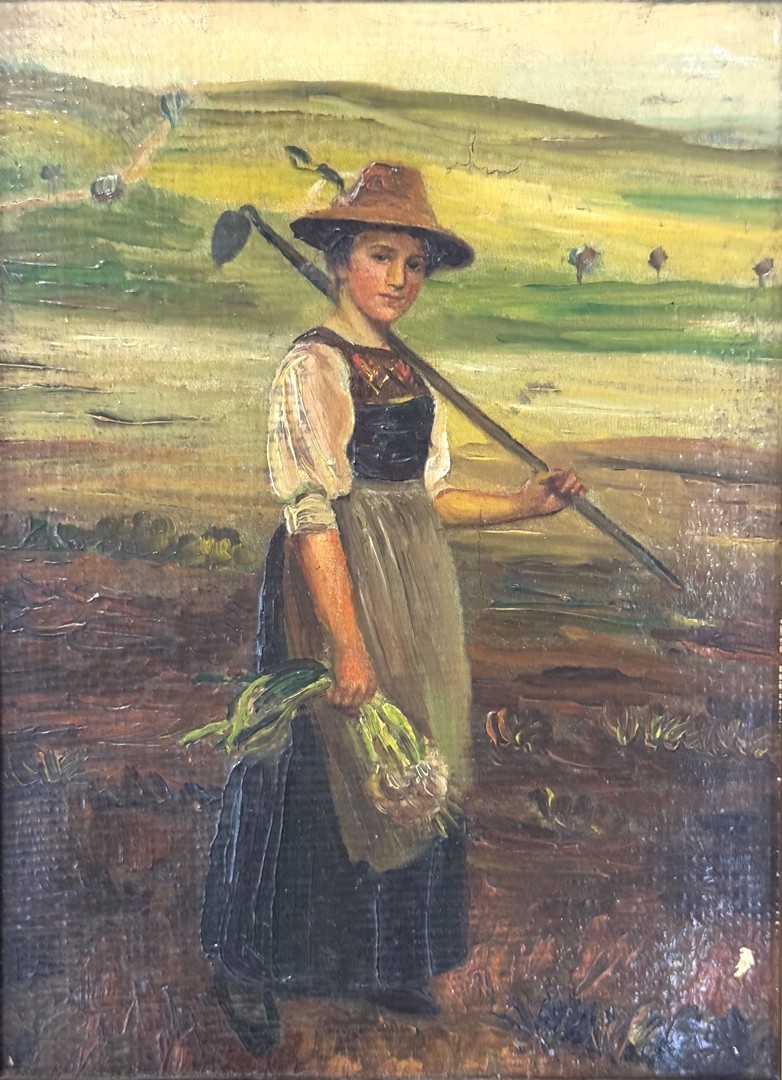 Das Gemälde zeigt eine junge Bäuerin bei der Ernte auf dem Feld. In der linken Hand hält sie eine Harke, während sie in der rechten Hand ihre Ernte hält.