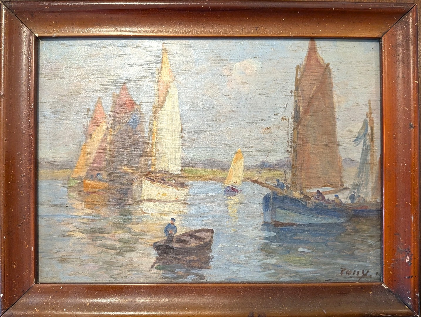 Anonym (19./20. Jahrhundert) Seelandschaft, Öl auf Leinwand. Das Gemälde zeigt eine Seelandschaft mit Segelbooten und einem Ruderboot, die in einem impressionistischen Stil gemalt ist. Holzrahmen ist teilweise leicht beschädigt und etwas locker.
