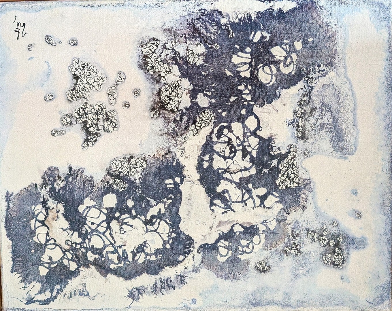 Los 504 - Anonym (20. Jahrhundert) "AUF EINMAL" 1966, Mischtechnik auf Leinwand. Das Gemälde zeigt eine abstrakte Komposition, bei der dunkle, organisch wirkende Formen auf einer hellen, strukturierten Fläche verteilt sind.