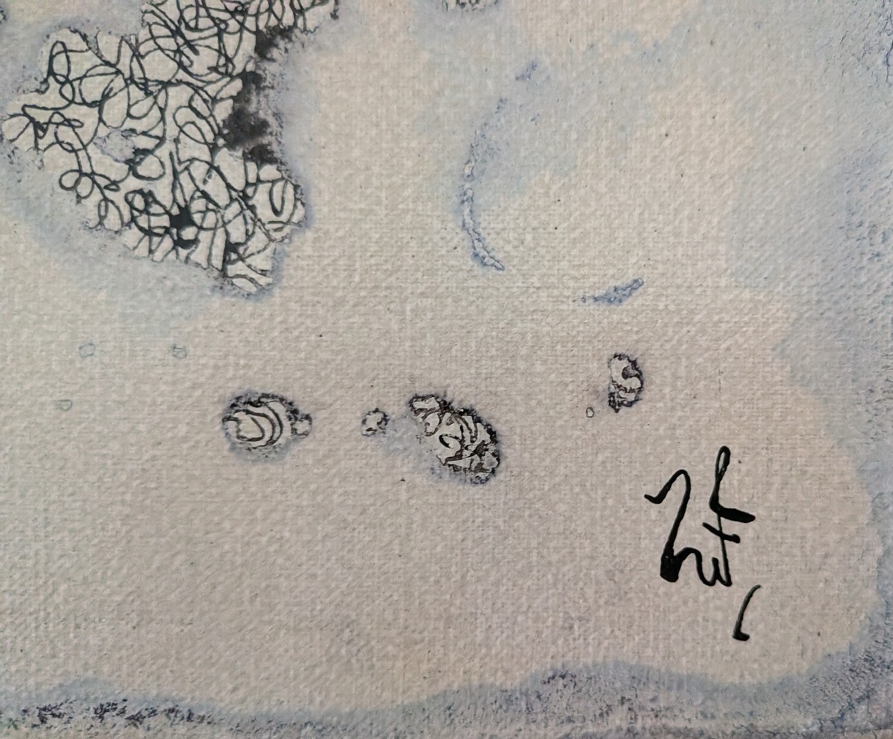 Anonym (20. Jahrhundert) "AUF EINMAL" 1966, Mischtechnik auf Leinwand. Das Gemälde zeigt eine abstrakte Komposition, bei der dunkle, organisch wirkende Formen auf einer hellen, strukturierten Fläche verteilt sind.