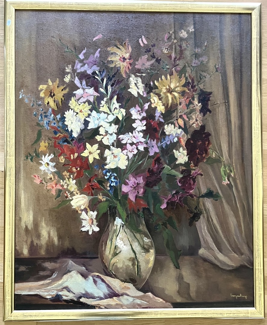 Anonym (20. Jahrhundert) Blumenstrauß, Öl auf Presskarton. Filigran gemalter Blumenstrauß. Ein Duft von Sommer. Durch den braun gehaltenen Hintergrund wirken die Blumen besonders leuchtend.