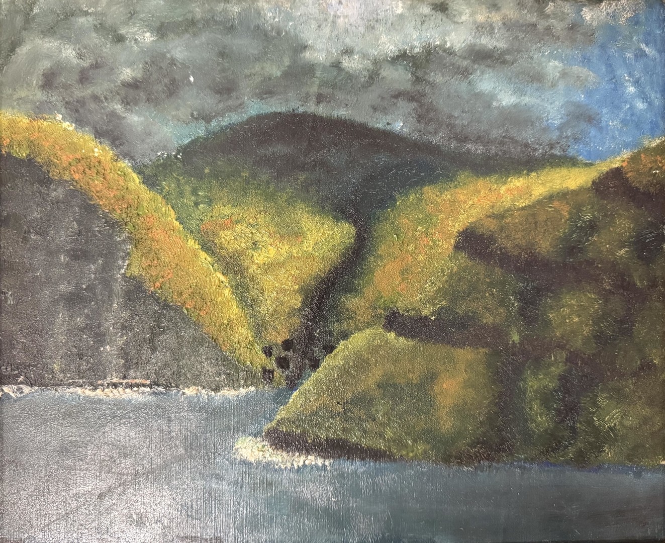 In dunklem Blau liegt das Meer vor der Küste und schlägt an den begrünten Bergen auf. Die darüberliegenden Wolken türmen sich in einem dunklen Grau-Grün auf.