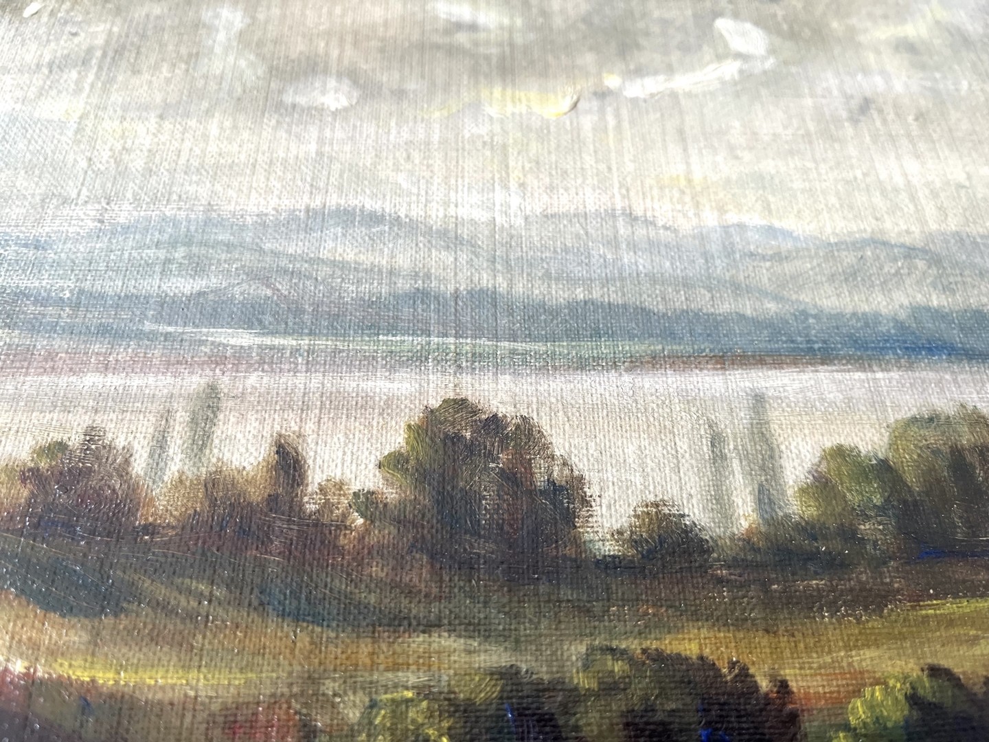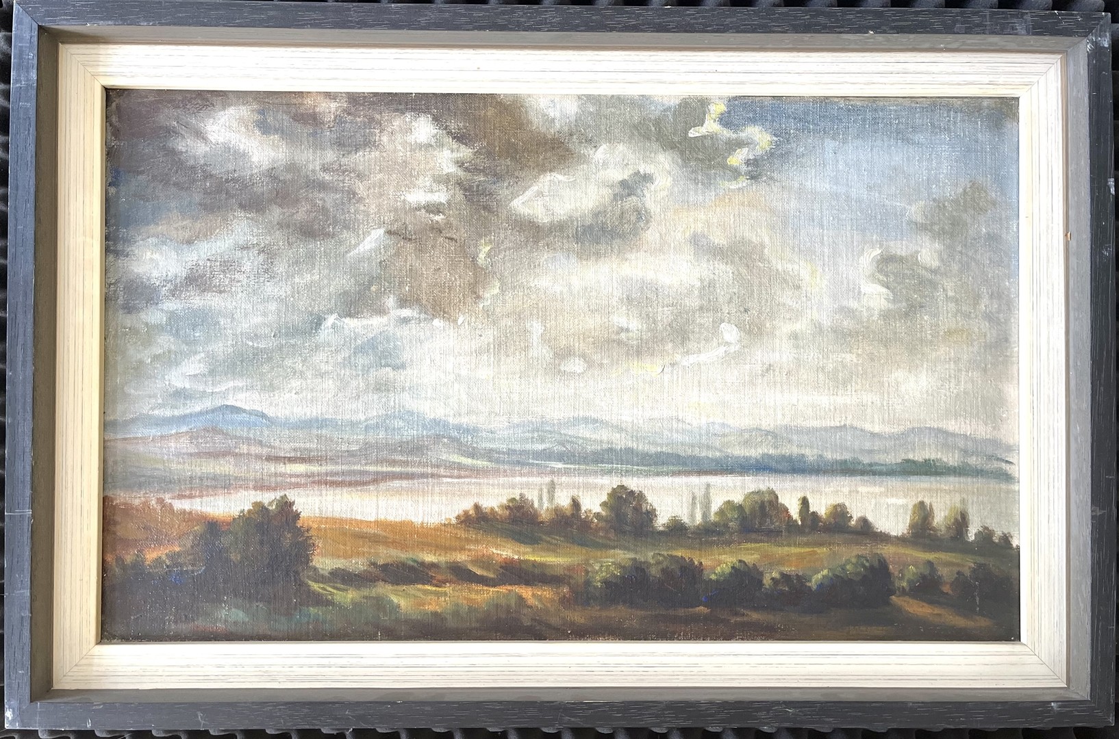 Anonym (20. Jahrhundert), Seenlandschaft, Öl auf Platte. Breites Panorama der Landschaft bei Stürmungen - gut zu erkennen durch die in Winden liegenden Bäume.