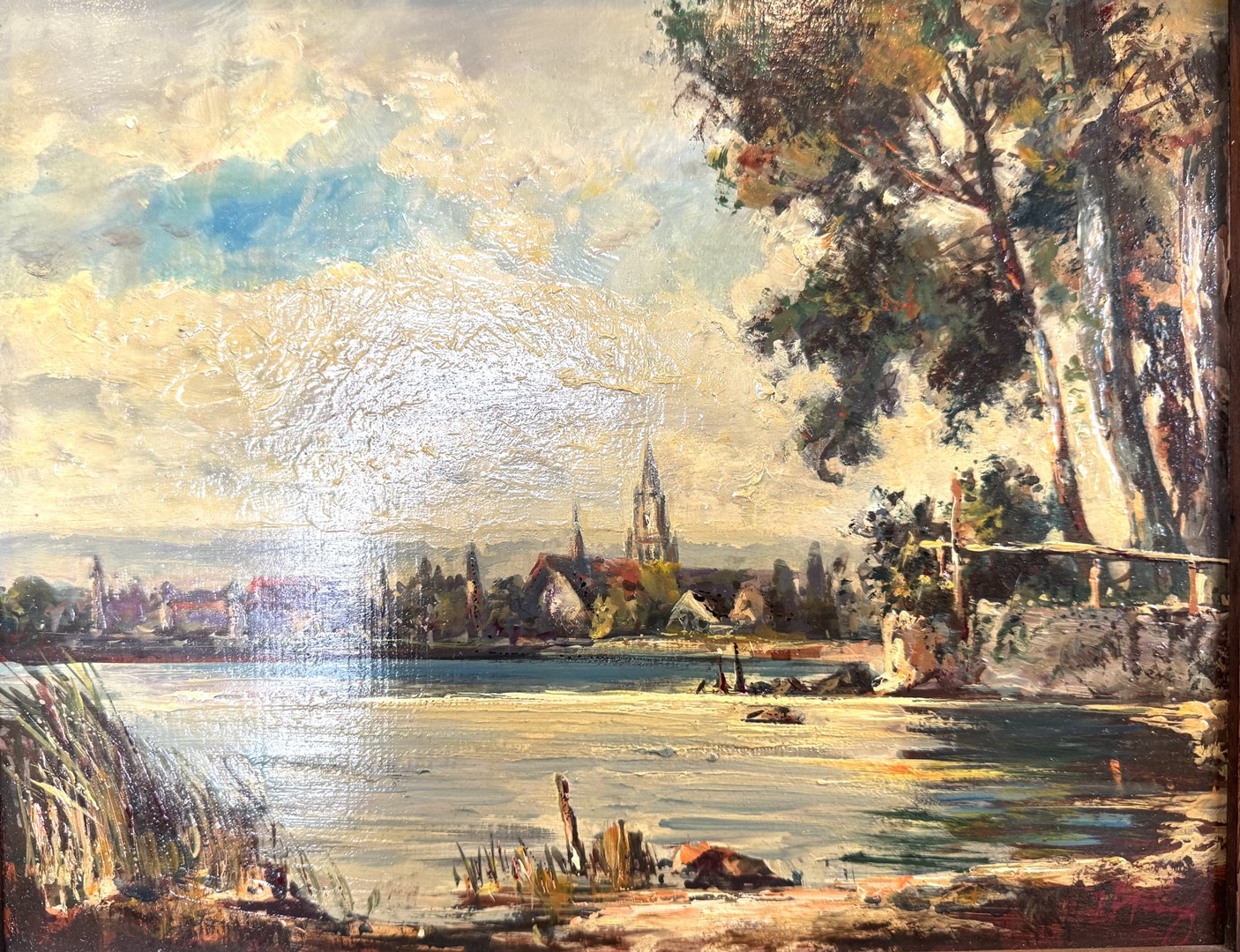 Die ruhige Bucht wird eingerahmt durch wachsende Gräser und Bäume am Bildrand und eröffnet so einen Blick auf das Stadtbild von Konstanz, wobei das Münster besonders heraussticht.