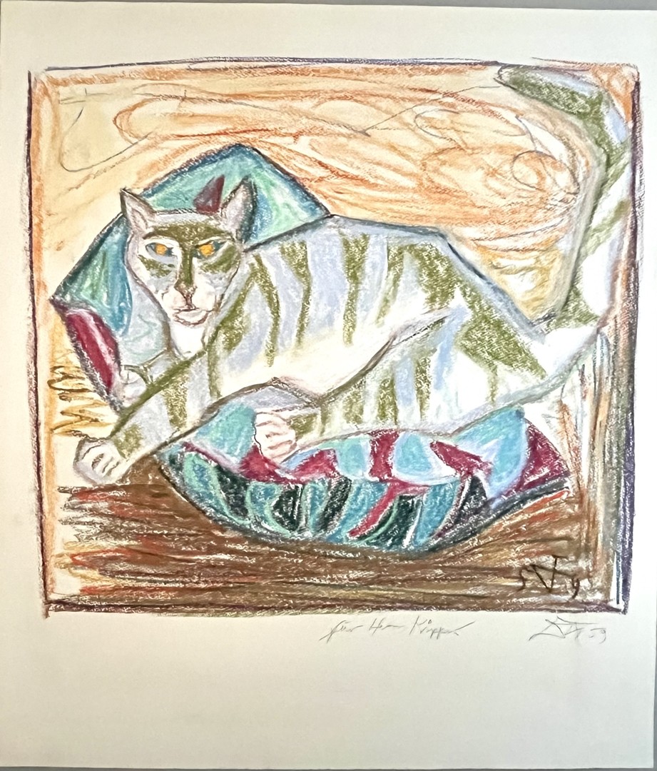 Zeichnung eines grau-grün gestreiften Katers auf einem Kissen. In Erdtönen wird der Hintergrund und Boden angedeutet. Typisches Pastellwerk von Dix. Unter dem Bild mittige Widmung "für Herrn Küpper" sowie rechts unten signiert in Bleistift und datiert "[19]59".